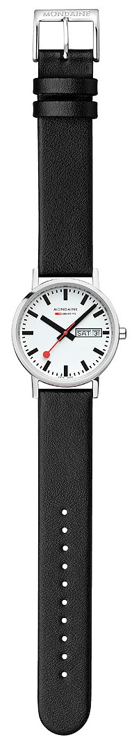 MONDAINE Classic A667.30314.11SBBV jsou dámské hodinky na černém řemínku z veganské kůže s trnovou sponou. Pouzdro z nerezové oceli má průměr 36 milimetrů. Přehledný bílý číselník s ukazatelem data a dne v týdnu na třetí hodině je chráněn minerálním sklíčkem a je inspirován ikonickými nádražními hodinami s červenou sekundovou ručkou. Pohon hodinek zajišťuje quartzový strojek Ronda 517. S vodotěsností 3 ATM jsou hodinky odolné proti dešti a při mytí rukou.