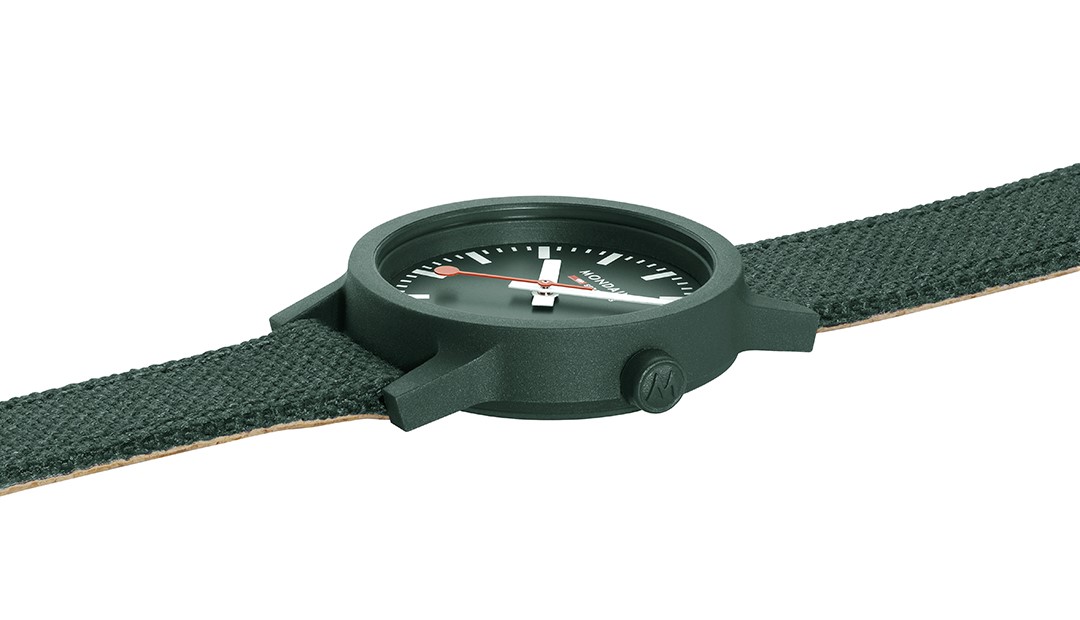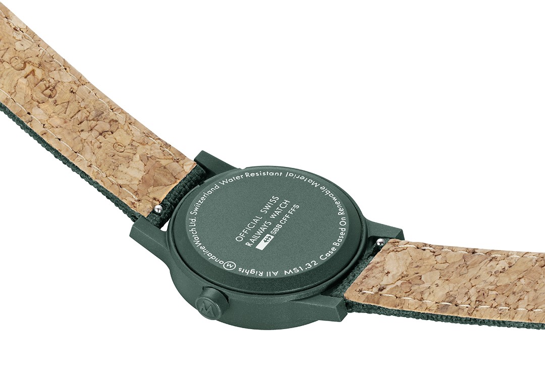 MONDAINE Essence MS1.32160.LF jsou dámské hodinky na zeleném textilním řemínku z recyklovaných PET lahví s korkovou podšívkou a trnovou sponou. Pouzdro o průměru 32 milimetrů je vyrobeno z polyamidu na bázi ricinového oleje. Přehledný zelený číselník je chráněn minerálním sklíčkem a je inspirován ikonickými nádražními hodinami s červenou sekundovou ručkou. Pohon hodinek zajišťuje quartzový strojek Ronda 513. S vodotěsností 3 ATM jsou hodinky odolné proti dešti a při mytí rukou.