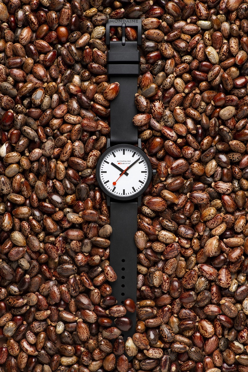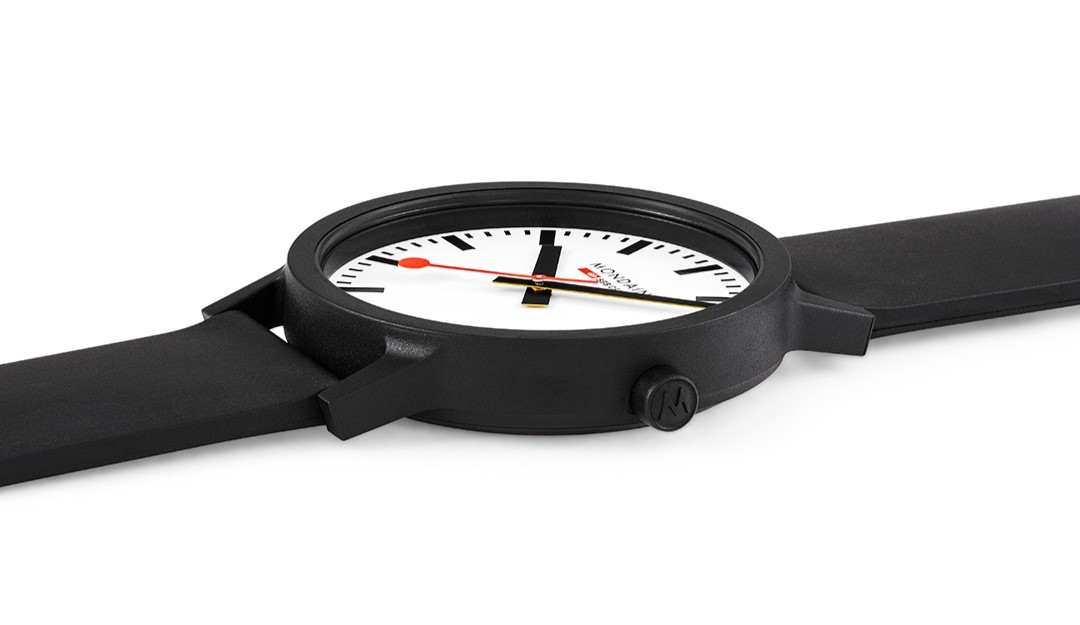 MONDAINE Essence MS1.41110.RB jsou pánské hodinky na černém plastovém řemínku na bázi ricinového oleje s trnovou sponou. Pouzdro o průměru 41 milimetrů je vyrobeno z recyklovaného plastu. Přehledný bílý číselník je chráněn minerálním sklíčkem a je inspirován ikonickými nádražními hodinami s červenou sekundovou ručkou. Pohon hodinek zajišťuje quartzový strojek Ronda 513. S vodotěsností 3 ATM jsou hodinky odolné proti dešti a při mytí rukou.