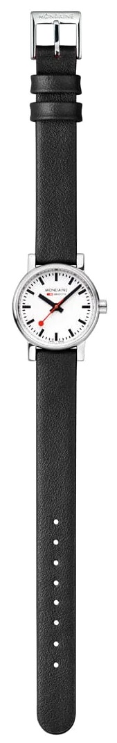 MONDAINE Evo2 MSE.26110.LBV jsou dámské elegantní bateriové hodinky na černém řemínku z veganské kůže s trnovou sponou. Pouzdro z nerezové oceli má průměr 26 milimetrů. Přehledný bílý číselník je chráněn safírovým sklíčkem a je inspirován ikonickými nádražními hodinami s červenou sekundovou ručkou. Pohon hodinek zajišťuje quartzový strojek Ronda 513. S vodotěsností 3 ATM jsou hodinky odolné proti dešti a při mytí rukou.
