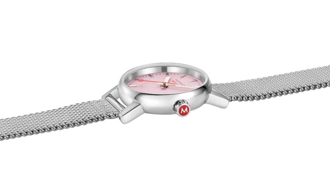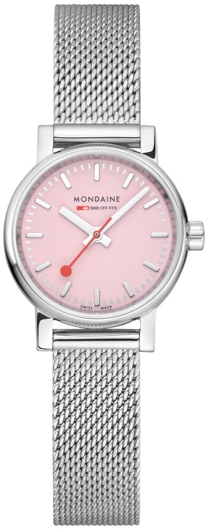 MONDAINE Evo2 MSE.26130.SM jsou dámské elegantní bateriové hodinky na ocelovém milánském tahu s posuvnou sponou. Pouzdro z nerezové oceli má průměr 26 milimetrů. Přehledný růžový číselník je chráněn safírovým sklíčkem a je inspirován ikonickými nádražními hodinami s červenou sekundovou ručkou. Pohon hodinek zajišťuje quartzový strojek Ronda 513. S vodotěsností 3 ATM jsou hodinky odolné proti dešti a při mytí rukou.