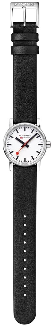 MONDAINE Evo2 MSE.30110.LBV jsou dámské elegantní bateriové hodinky na černém řemínku z veganské kůže s trnovou sponou. Pouzdro z nerezové oceli má průměr 30 milimetrů. Přehledný bílý číselník je chráněn safírovým sklíčkem a je inspirován ikonickými nádražními hodinami s červenou sekundovou ručkou. Pohon hodinek zajišťuje quartzový strojek Ronda 503. S vodotěsností 3 ATM jsou hodinky odolné proti dešti a při mytí rukou.