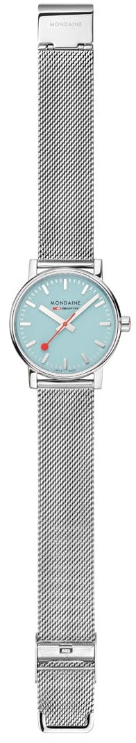 MONDAINE Evo2 MSE.35140.SM jsou dámské elegantní bateriové hodinky na ocelovém milánském tahu s posuvnou sponou. Pouzdro z nerezové oceli má průměr 35 milimetrů. Přehledný světle modrý číselník je chráněn safírovým sklíčkem a je inspirován ikonickými nádražními hodinami s červenou sekundovou ručkou. Pohon hodinek zajišťuje quartzový strojek Ronda 503. S vodotěsností 3 ATM jsou hodinky odolné proti dešti a při mytí rukou.