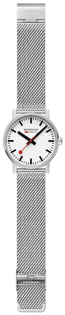 MONDAINE Evo2 MSE.43110.SJ jsou pánské elegantní bateriové hodinky na ocelovém milánském tahu s posuvnou sponou. Pouzdro z nerezové oceli má průměr 43 milimetrů. Přehledný bílý číselník je chráněn safírovým sklíčkem a je inspirován ikonickými nádražními hodinami s červenou sekundovou ručkou. Pohon hodinek zajišťuje quartzový strojek Ronda 513. S vodotěsností 3 ATM jsou hodinky odolné proti dešti a při mytí rukou.