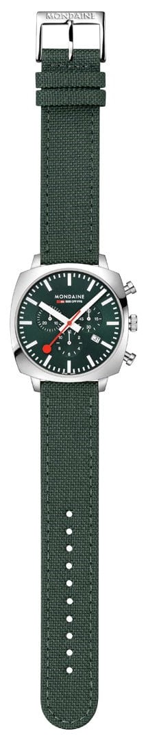 MONDAINE Grand Cushion MSL.41460.LF.SET jsou pánské sportovní bateriové hodinky na zeleném textilním řemínku z recyklovaných PET lahví s korkovou podšívkou a trnovou sponou. Hranaté pouzdro z nerezové oceli je široké 41 milimetrů. Zelený číselník s efektem slunečního brusu, stopkami a ukazatelem data je chráněn safírovým sklíčkem s antireflexní vrstvou a je inspirován ikonickými nádražními hodinami s červenou sekundovou ručkou. Ručičky disponují luminiscenčním nátěrem Super-LumiNova®, který garantuje perfektní čitelnost za zhoršených světelných podmínek. Pohon hodinek zajišťuje quartzový strojek Ronda 5030. S vodotěsností 5 ATM jsou hodinky odolné proti dešti a při sprchování. Součástí balení je navíc ocelový milánský tah.
