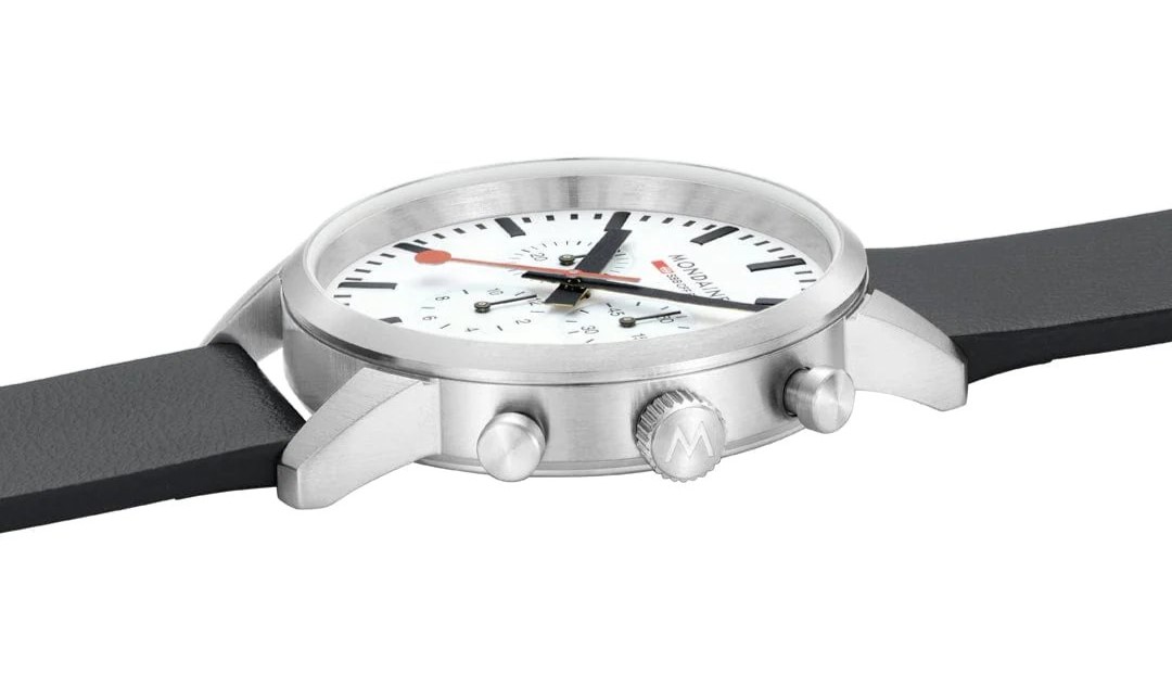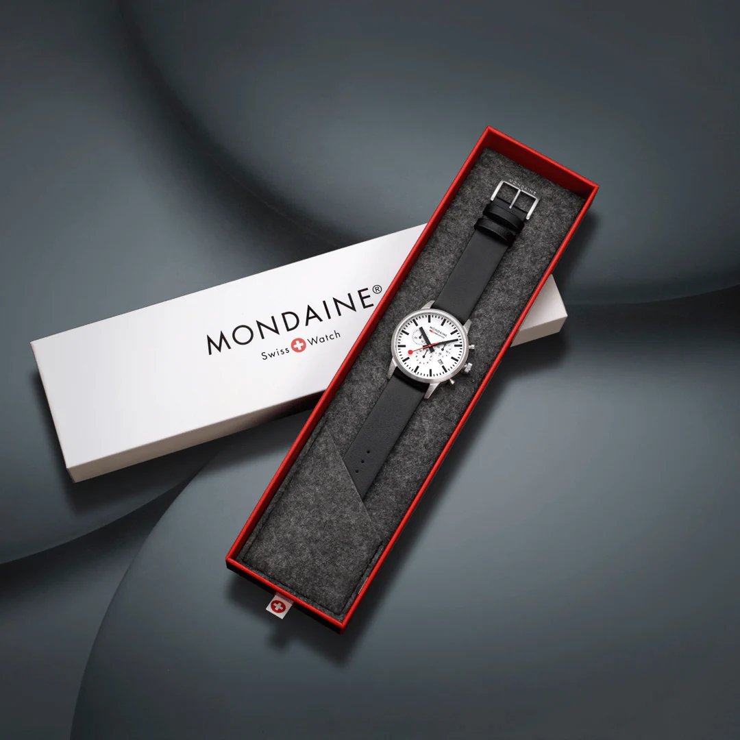 MONDAINE Neo MSD.41411.LBV jsou pánské sportovně elegantní bateriové hodinky na černém řemínku z veganské kůže s trnovou sponou. Pouzdro z nerezové oceli má průměr 41 milimetrů. Bílý číselník se stopkami a ukazatelem data je chráněn safírovým sklíčkem s antireflexní vrstvou a je inspirován ikonickými nádražními hodinami s červenou sekundovou ručkou. Pohon hodinek zajišťuje quartzový strojek Ronda 5030. S vodotěsností 5 ATM jsou hodinky odolné proti dešti a při sprchování.