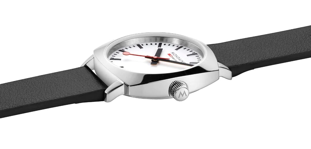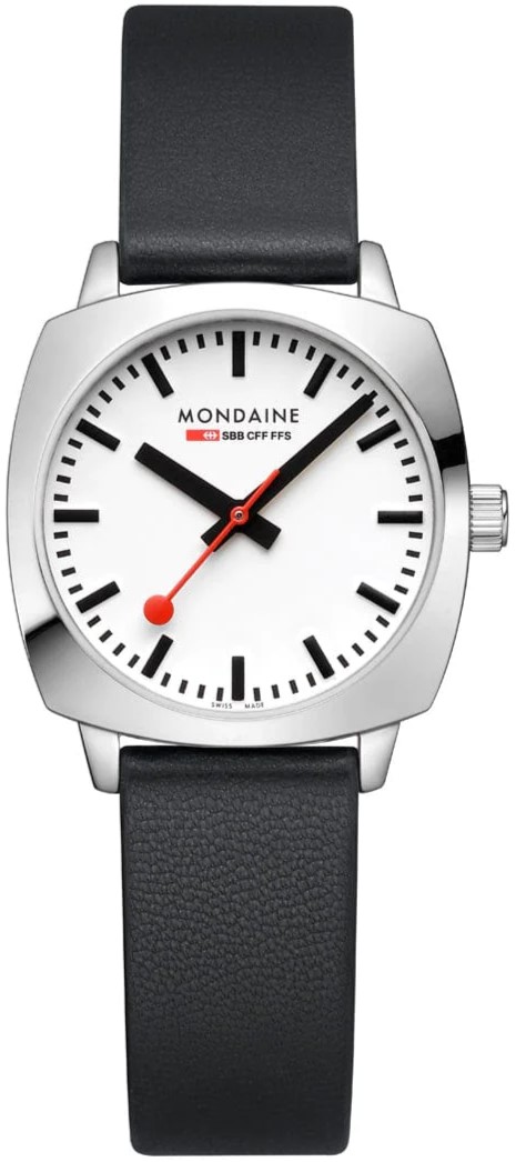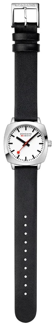 MONDAINE Petite Cushion MSL.31110.LBV jsou dámské elegantní bateriové hodinky na černém řemínku z veganské kůže s trnovou sponou. Hranaté pouzdro z nerezové oceli je široké 31 milimetrů. Přehledný bílý číselník je chráněn safírovým sklíčkem s antireflexní vrstvou a je inspirován ikonickými nádražními hodinami s červenou sekundovou ručkou. Pohon hodinek zajišťuje quartzový strojek Ronda 503. S vodotěsností 5 ATM jsou hodinky odolné proti dešti a při sprchování.