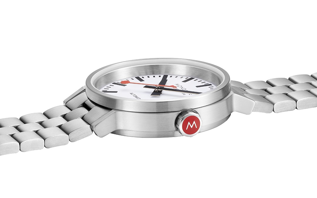 MONDAINE The Original Automatic MST.4161B.SJ jsou pánské automatické hodinky v klasickém stylu na ocelovém náramku s překlápěcí sponou. Pouzdro z nerezové oceli má průměr 41 milimetrů a průhledné dýnko. Přehledný bílý číselník je chráněn safírovým sklíčkem a je inspirován ikonickými nádražními hodinami s červenou sekundovou ručkou. Ručičky disponují luminiscenčním nátěrem Super-LumiNova®, který garantuje lepší čitelnost za zhoršených světelných podmínek. Pohon hodinek zajišťuje mechanický strojek SW200-2 s automatickým nátahem a rezervou chodu 38 hodin. S vodotěsností 5 ATM jsou hodinky odolné proti dešti a při sprchování.