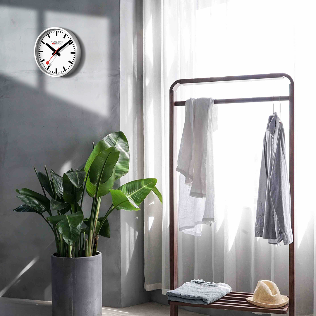 MONDAINE A995.CLOCK.16SBB jsou nástěnné hodiny s hliníkovým pouzdrem o průměru 400 milimetrů. Číselník v matné bílé barvě je chráněn tvrzeným minerálním sklem a je inspirován ikonickými nádražními hodinami s červenou sekundovou ručkou. Chod hodin zajišťuje quartzový strojek.