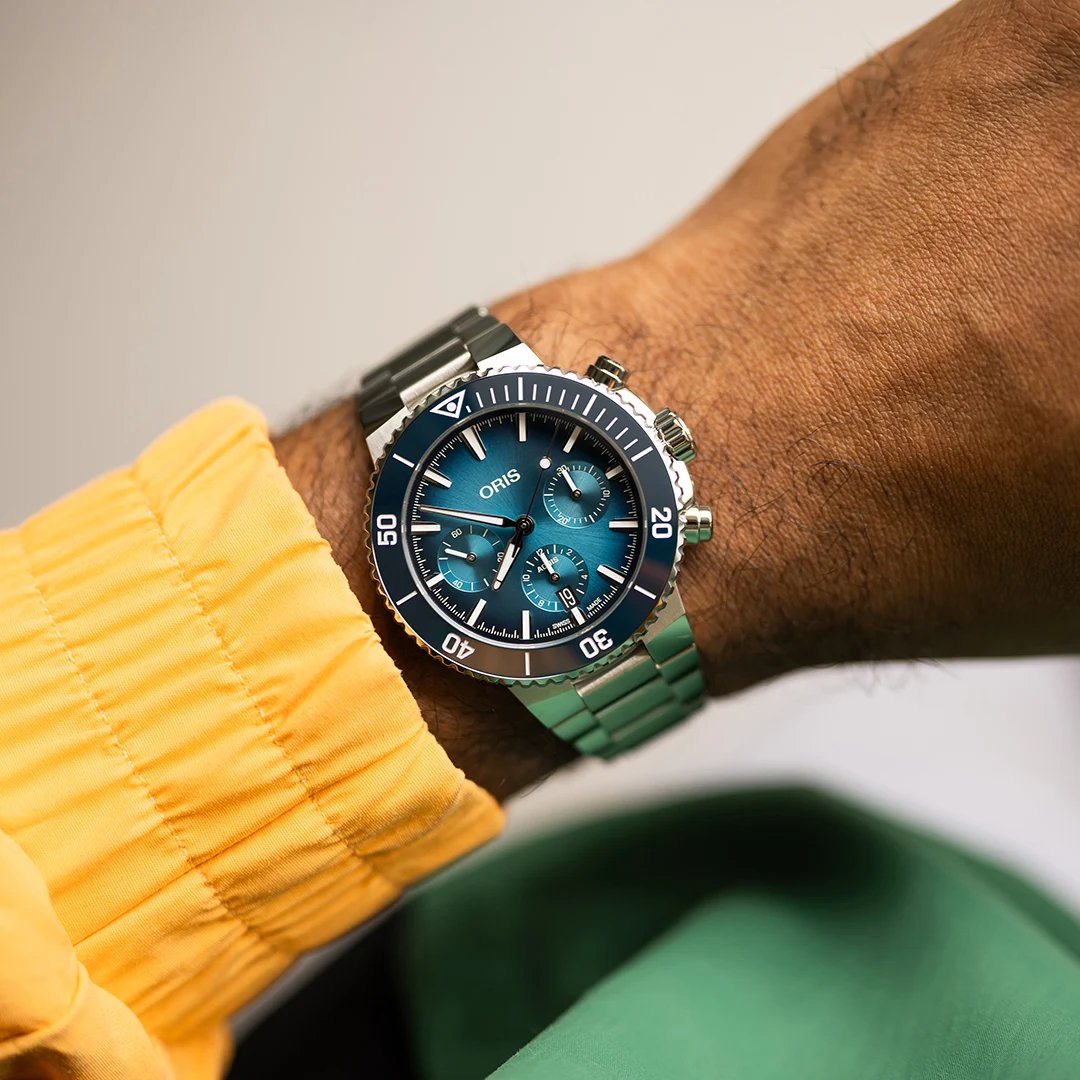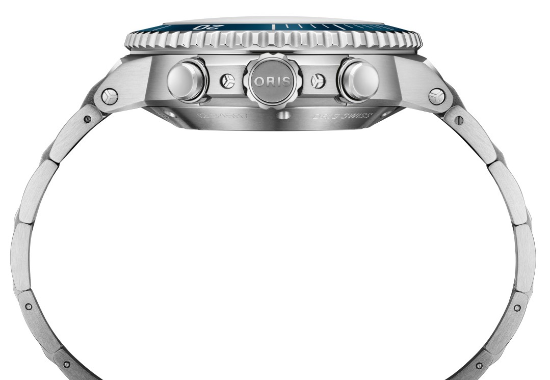 Nový chronograf má společné znaky s novou kolekcí Aquis Date a vyznačuje se stejným důrazem pro detail a stejným počtem ergonomických, estetických a výkonnostních vychytávek. Pouzdro a luneta mají užší profil, i náramek je jemně zúžený. Zůstává zachován známý koncept modelu Aquis jako vysoce odolných hodinek pro každodenní nošení - nechybí šroubovací korunka s ochranou, jednosměrně otočná luneta s keramickou vložkou, luminiscenční detaily, průhledná zadní strana pouzdra a voděodolnost 30 ATM (300 metrů). Srdcem hodinek je automatický strojek švýcarské výroby Oris Calibre 771, který má funkci hackingu pro přesné nastavení času a rezervu chodu 62 hodin. Elegantním dojmem působí modrý číselník s gradientem, který připomíná sluneční paprsky pronikající vodou. Na číselníku jsou 3 sčítače (sčítač pro zobrazení sekund, 30minutový sčítač a 12hodinový sčítač) a indikace data na pozici 6 hodin.