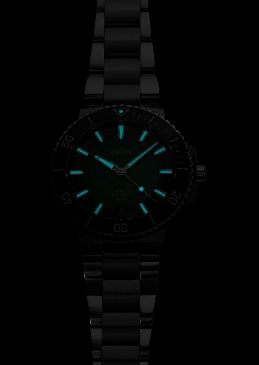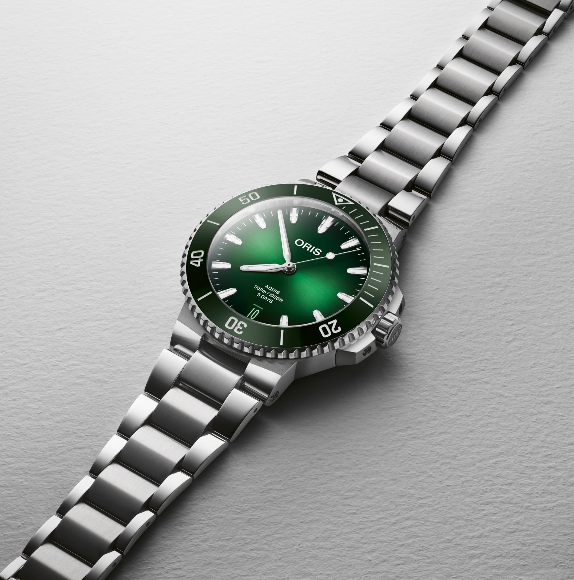 Oris Aquis Date 01 400 7790 4157-07 8 23 02PEB jsou pánské automatické hodinky na ocelovém náramku v kombinaci brusu a lesku s překlápěcí sponou. Pouzdro z nerezové oceli má průměr 43,5 milimetru, průhledné dýnko a jednosměrně otočnou lunetu s keramickou vložkou s potápěčskou stupnicí. Zelený číselník s efektem slunečního brusu a indikací data na šesté hodině je chráněn odolným safírovým sklem s antireflexní vrstvou. Ručičky, indexy a část lunety jsou pokryty luminiscenčním nátěrem Super-LumiNova®, který garantuje perfektní čitelnost za zhoršených světelných podmínek. Pohon hodinek zajišťuje mechanický manufakturní strojek Oris 400 s automatickým nátahem a nadstandardní rezervou chodu ve výši 5 dní. Strojek disponuje dvěma pérovníky a chybí mu tradiční červený rotor, čímž se kalibr 400 odlišuje od modelů značky s běžnými strojky. Kromě pětidenní rezervy chodu nabízí strojek ještě zvýšenou odolnost vůči magnetismu, čemuž napomáhají mimo jiné kotva a krokové kolo z křemíku. Oris u tohoto strojku doporučuje servisní interval 10 let, tedy dvojnásobek doporučené doby u běžných mechanických hodinek, a především strojku věří natolik, že u něj poskytuje záruku taktéž ve výši 10 let! Tento strojek s funkcí hackingu, který lze v případě potřeby natahovat i ručně pomocí signované šroubovací korunky. Vodotěsnost hodinek činí 30 ATM a jsou tak vhodnou volbou pro šnorchlování a potápění.