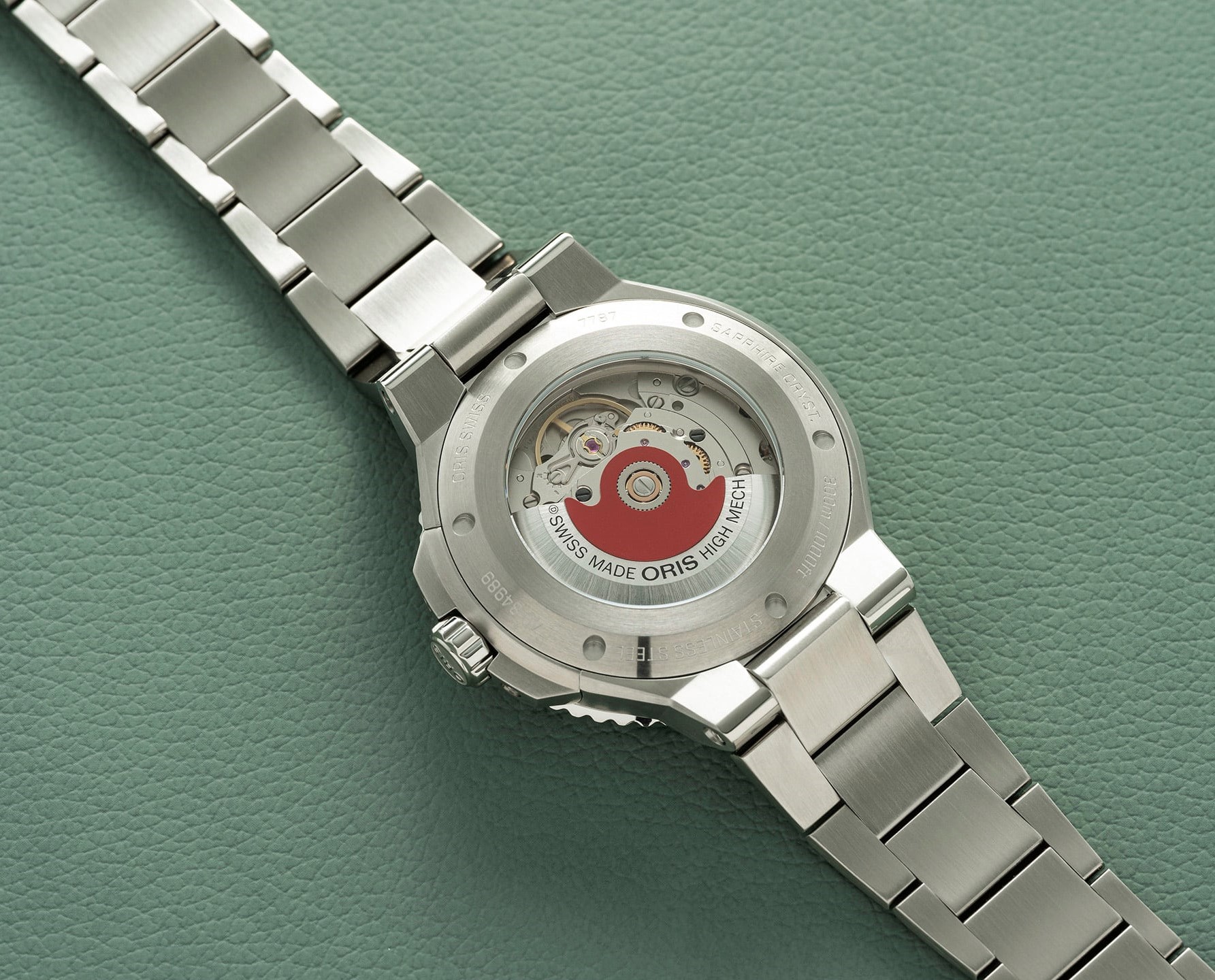 Oris Aquis Date 01 733 7787 4157-07 8 22 04PEB jsou pánské automatické hodinky na ocelovém náramku v kombinaci brusu a lesku s překlápěcí sponou. Pouzdro z nerezové oceli má průměr 41,5 milimetru, průhledné dýnko a jednosměrně otočnou lunetu s keramickou vložkou s potápěčskou stupnicí. Zelený číselník s efektem slunečního brusu a indikací data na šesté hodině je chráněn odolným safírovým sklem s antireflexní vrstvou. Ručičky, indexy a část lunety jsou pokryty luminiscenčním nátěrem Super-LumiNova®, který garantuje perfektní čitelnost za zhoršených světelných podmínek. Pohon hodinek zajišťuje mechanický strojek Oris 733 s automatickým nátahem a rezervou chodu přibližně 38 hodin. Základem tohoto kalibru je Sellita SW200-1. Tento strojek s funkcí hackingu lze v případě potřeby natahovat i ručně pomocí signované šroubovací korunky. Vodotěsnost hodinek činí 30 ATM a jsou tak vhodnou volbou pro šnorchlování a potápění.