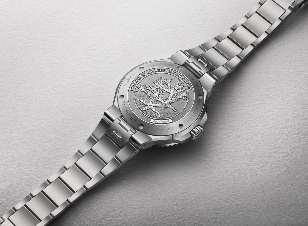 Ocelové pouzdro limitované edice Oris Aquis Date Great Barrier Reef Limited Edition IV 01 400 7790 4185-Set má průměr 43,5 milimetru, dýnko zdobené rytinou korálových útesů a jednosměrně otočnou lunetu s wolframovou vložkou s potápěčskou stupnicí. Tyrkysově modrý gradientní číselník s indikací data na šesté hodině je chráněn odolným safírovým sklem s antireflexní vrstvou. Ručičky, indexy a část lunety jsou pokryty luminiscenčním nátěrem Super-LumiNova®, který garantuje perfektní čitelnost za zhoršených světelných podmínek. Pohon hodinek zajišťuje mechanický manufakturní strojek Oris 400 s automatickým nátahem a nadstandardní rezervou chodu ve výši 5 dní. Strojek disponuje dvěma pérovníky a chybí mu tradiční červený rotor, čímž se kalibr 400 odlišuje od modelů značky s běžnými strojky. Kromě pětidenní rezervy chodu nabízí strojek ještě zvýšenou odolnost vůči magnetismu, čemuž napomáhají mimo jiné kotva a krokové kolo z křemíku. Oris u tohoto strojku doporučuje servisní interval 10 let, tedy dvojnásobek doporučené doby u běžných mechanických hodinek, a především strojku věří natolik, že u něj poskytuje záruku taktéž ve výši 10 let! Tento strojek s funkcí hackingu, který lze v případě potřeby natahovat i ručně pomocí signované šroubovací korunky. Vodotěsnost hodinek činí 30 ATM a jsou tak vhodnou volbou pro šnorchlování a potápění.