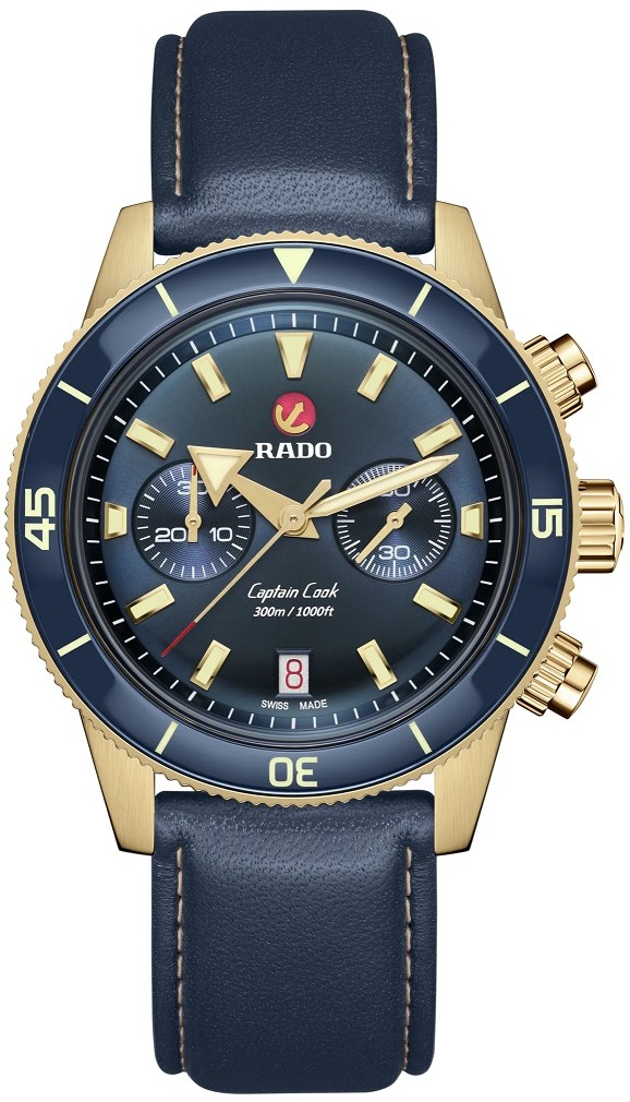 Rado Captain Cook Automatic Chronograph R32146208 jsou pánské potápěčské hodinky na modrém NATO strapu se zlatým pruhem a trnovou sponou. Bronzové pouzdro má průměr 43 milimetrů a dýnko z titanu. Pohon hodinek zajišťuje automatický strojek R801 (03.801.222) s hackingem, funkcí chronografu a rezervou chodu 59 hodin. Přesné měření času zajišťuje mimo jiné i antimagnetický vlásek setrvačky Nivachron™ z titanové slitiny, na jehož vývoji se spolu se Swatch Group podílela manufaktura Audemars Piguet. Pro dosažení co nejvyšší možné přesnosti je stroj testován v pěti pozicích.