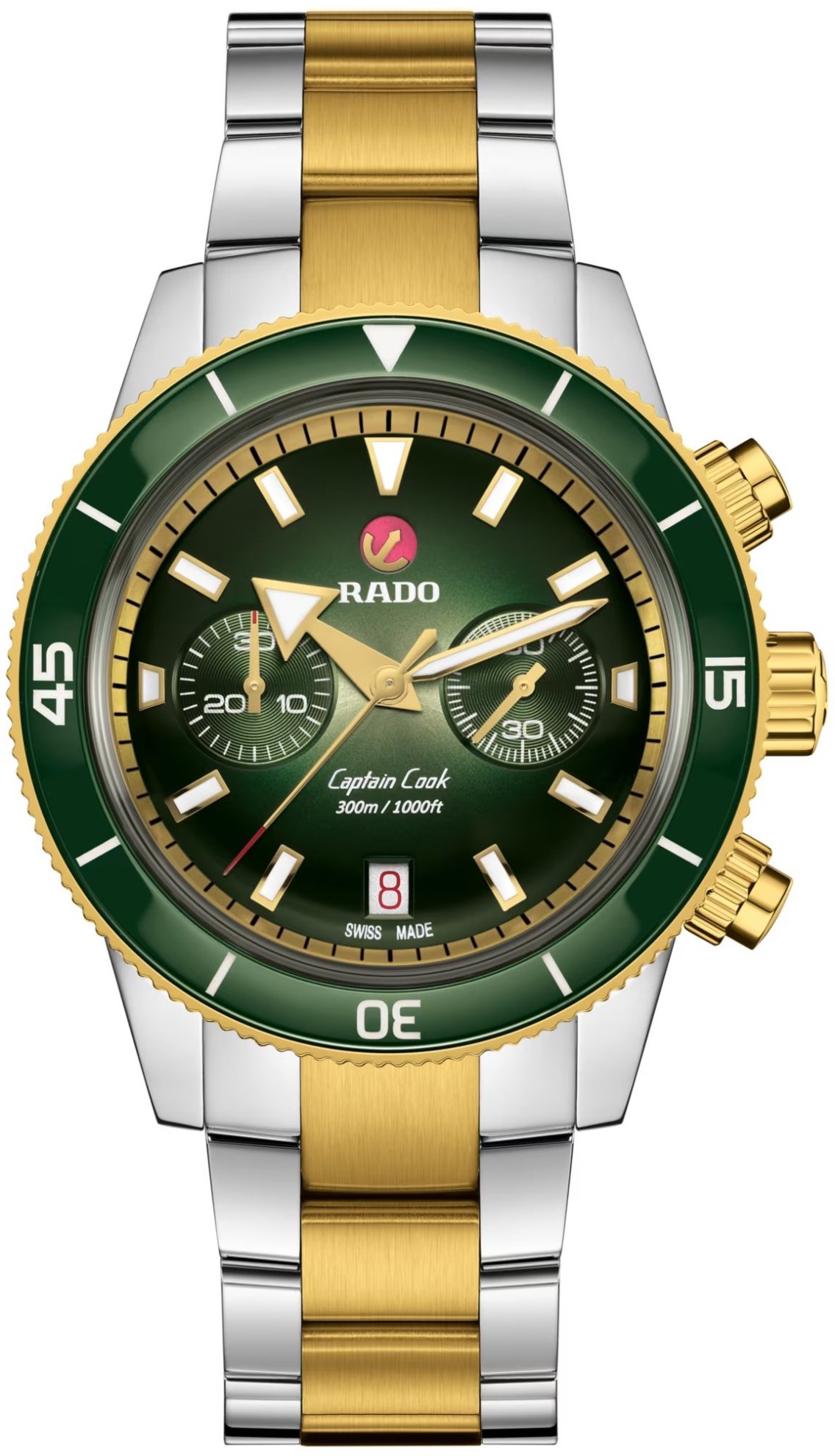 Rado Captain Cook Automatic Chronograph R32151318 jsou pánské potápěčské hodinky v bicolor provedení. Středové dílky kovového náramku jsou spolu s lunetou, tlačítky stopek a korunkou opatřeny PVD úpravou zlaté barvy. Pouzdro z nerezové oceli má průměr 43 milimetrů, leštěnou povrchovou úpravu a průhledné dýnko, kterým lze pozorovat perláží a ženevskými pruhy dekorovaný automatický strojek R801 (03.801.222) s hackingem, funkcí chronografu a rezervou chodu 59 hodin. Přesné měření času zajišťuje mimo jiné i antimagnetický vlásek setrvačky Nivachron™ z titanové slitiny, na jehož vývoji se spolu se Swatch Group podílela manufaktura Audemars Piguet. Pro dosažení co nejvyšší možné přesnosti je stroj testován v pěti pozicích.