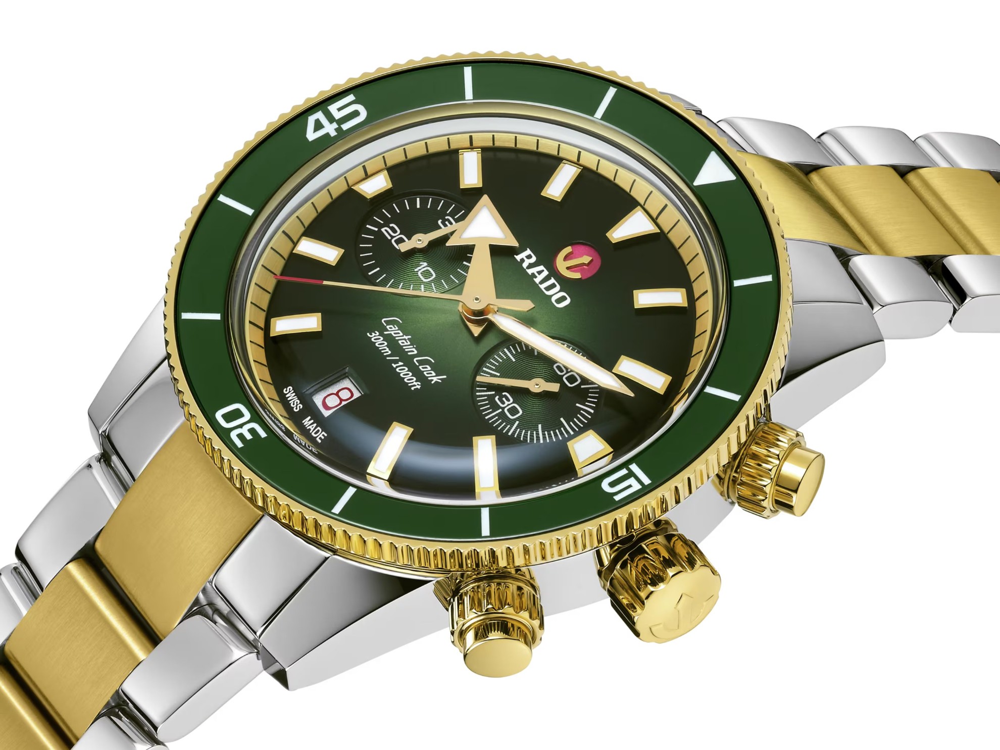 Gradientní číselník s efektem slunečního brusu chrání vypouklé safírové sklo s oboustrannou antireflexní vrstvou. Zelená barva číselníku plynule přechází do temného odstínu na samotném okraji. Na pozici 9. hodiny je umístěn subčíselník stopek, zatímco průběžná sekundová ručka je na pozici 3. hodiny. Tomuto symetrickému rozložení číselníku se přezdívá bicompax. Praktický ukazatel data najdeme na pozici 6. hodiny. Aplikované hodinové indexy i ručky ve zlaté barvě pokrývá luminiscenční nátěr Super-LumiNova®, který po nasvícení garantuje perfektní čitelnost za zhoršených světelných podmínek. Tlačítka stopek jsou stejně jako korunka šroubovací. I díky tomu mají hodinky vysokou vodotěsnost 300 metrů a jsou vhodné pro hlubinné potápění. Pomocí jednosměrně otočné lunety s keramickou vložkou a potápěčskou stupnicí lze lehce měřit časové intervaly nejen pod hladinou.