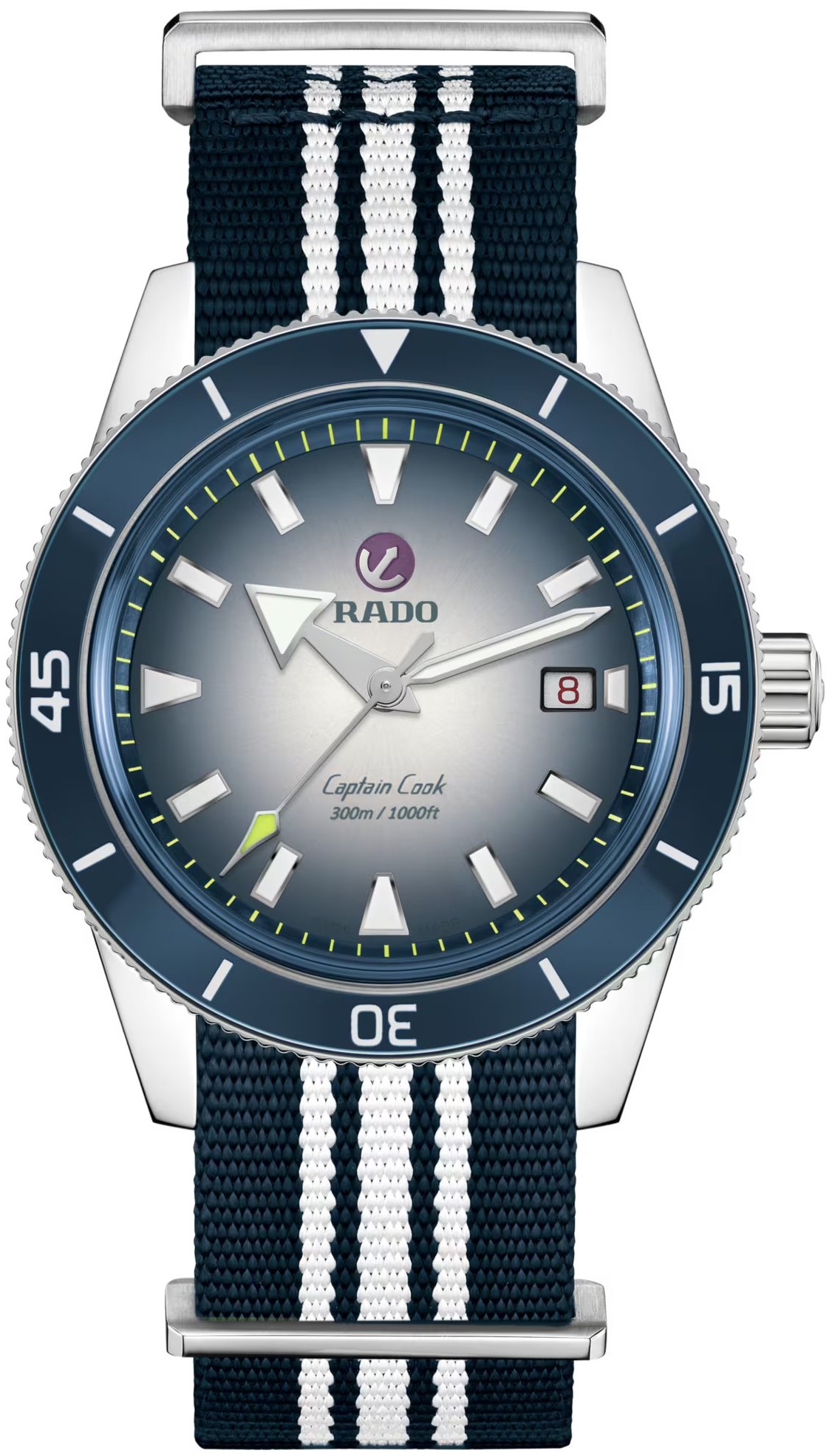 Rado Captain Cook Automatic R32154208 jsou pánské potápěčské hodinky na ocelovém náramku s překlápěcí sponou. Pouzdro z nerezové oceli má průměr 42 milimetrů, leštěnou povrchovou úpravu, šroubovací korunku a jednosměrně otočnou lunetu s modrou keramickou vložkou z materiálu High-Tech Ceramic. Gradientní lakovaný číselník chrání vypouklé safírové sklo s oboustrannou antireflexní vrstvou. Praktický ukazatel data najdeme na pozici 3. hodiny. Aplikované hodinové indexy i ručky pokrývá luminiscenční nátěr Super-LumiNova®, který po nasvícení garantuje perfektní čitelnost za zhoršených světelných podmínek.