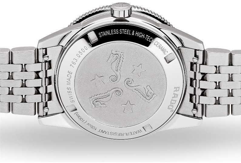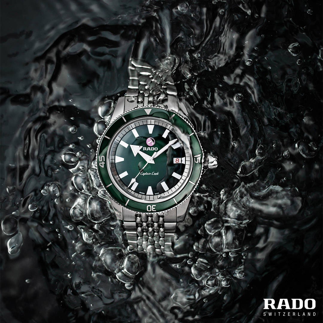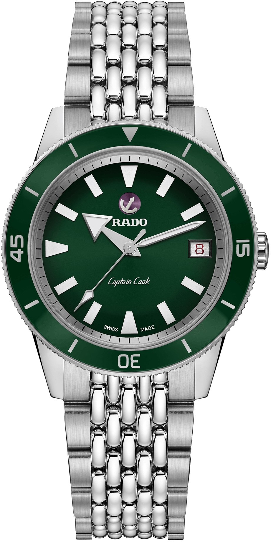 Rado Captain Cook R32500323 jsou dámské hodinky na kovovém náramku typu „beads of rice“, který svůj název získal proto, že jeho středové dílky připomínají zrnka rýže. Pouzdro z leštěné nerezové oceli má průměr 37 milimetrů a jednosměrně otočnou lunetu se zelenou keramickou vložkou z materiálu High-Tech Ceramic. Zelený číselník s datumovkou na pozici 3. hodiny je chráněn vypouklým safírovým sklem s oboustrannou antireflexní vrstvou. Aplikované hodinové indexy jsou stejně jako ručky pokryty luminiscenčním nátěrem Super-LumiNova®, který po nasvícení garantuje perfektní čitelnost za zhoršených světelných podmínek.