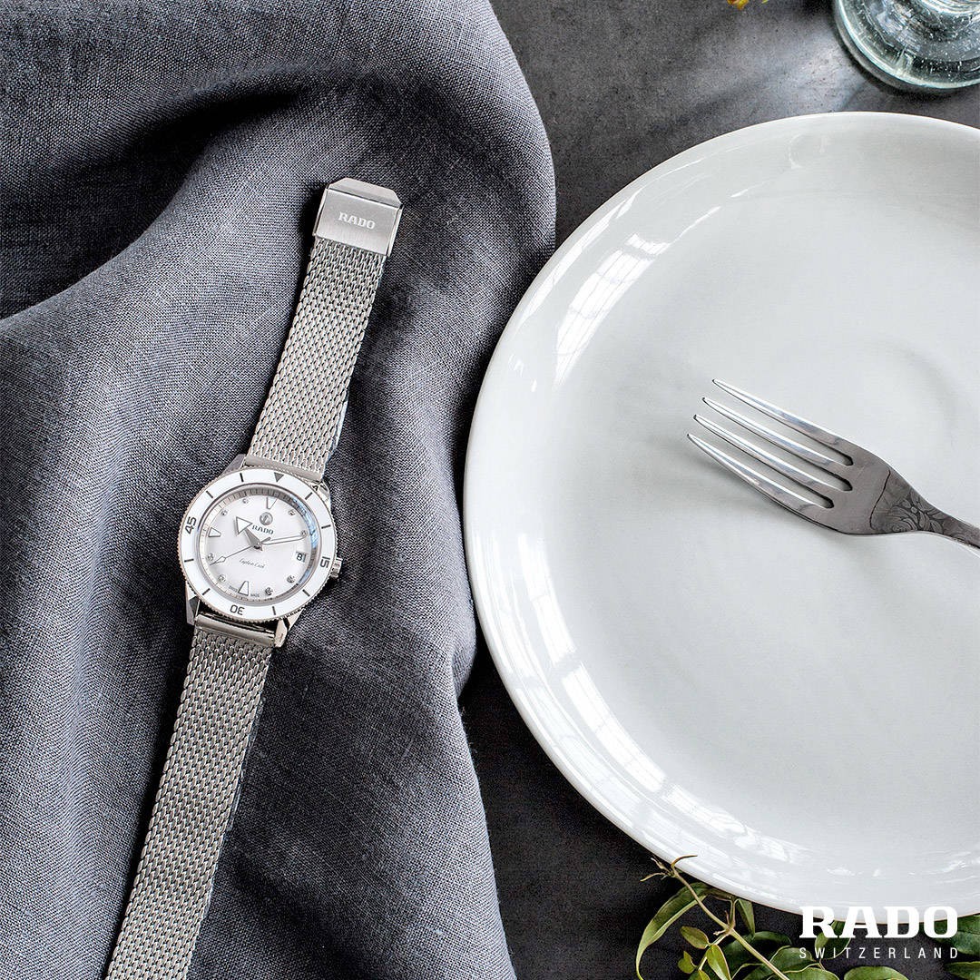 Rado Captain Cook R32500703 jsou dámské hodinky na ocelovém milánském tahu s posuvnou sponou. Pouzdro z leštěné nerezové oceli má průměr 37 milimetrů a jednosměrně otočnou lunetu s bílou keramickou vložkou z materiálu High-Tech Ceramic. Stříbrný číselník s datumovkou a 8 diamanty o hmotnosti 0,064 ct je chráněn vypouklým safírovým sklem s oboustrannou antireflexní vrstvou. Aplikované hodinové indexy jsou stejně jako ručky pokryty luminiscenčním nátěrem Super-LumiNova®, který po nasvícení garantuje perfektní čitelnost za zhoršených světelných podmínek.