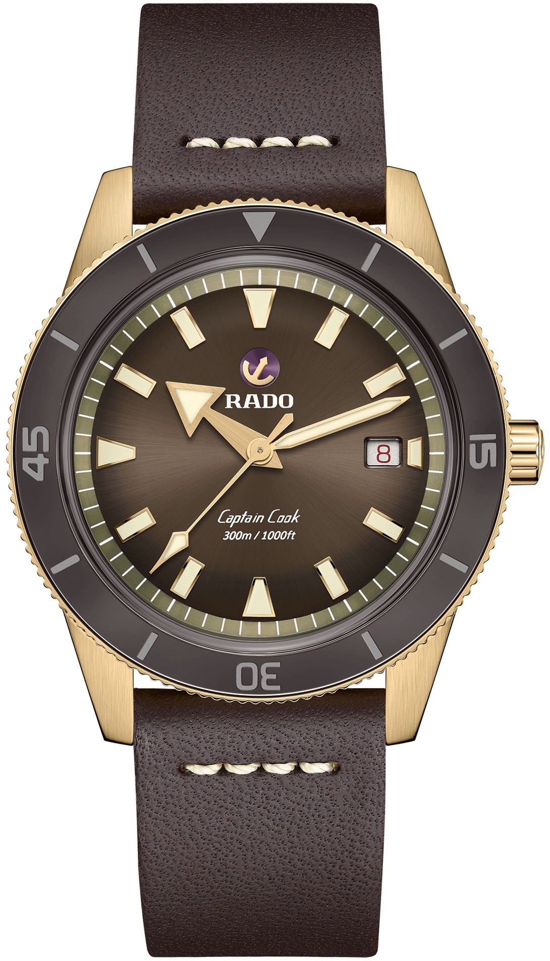 Rado Captain Cook Bronze R32504306 jsou pánské potápěčské hodinky na koženém řemínku hnědé barvy. Bronzové pouzdro má průměr 42 milimetrů a jednosměrně otočnou lunetu s hnědou keramickou vložkou z materiálu High-Tech Ceramic. Hnědý číselník s efektem slunečního brusu a datumovkou na pozici 3. hodiny je chráněn vypouklým safírovým sklem s oboustrannou antireflexní vrstvou. Aplikované hodinové indexy jsou stejně jako ručky pokryty luminiscenčním nátěrem Super-LumiNova®, který po nasvícení garantuje perfektní čitelnost za zhoršených světelných podmínek. Pohon hodinek zajišťuje mechanický strojek R763 (03.763.935) s automatickým nátahem a rezervou chodu 80 hodin. Tento strojek s funkcí hackingu (zastavení vteřinové ručky při vytažení korunky do krajní polohy) je možné v případě potřeby natahovat i ručně. Díky použití antimagnetického vlásku setrvačky Nivachron™ z titanové slitiny, na jehož vývoji se spolu se Swatch Group podílela manufaktura Audemars Piguet, je tento kalibr vysoce odolný vůči vlivům magnetického pole. Pro dosažení co nejvyšší možné přesnosti je stroj testován v pěti pozicích. Hodinky disponují šroubovací korunkou a vysokou vodotěsností 300 metrů, jsou tedy vhodnou volbou pro hlubinné potápění. Díky systému EasyClip pro snadnou výměnu řemínku, lze jednoduchým způsobem měnit jejich vzhled.