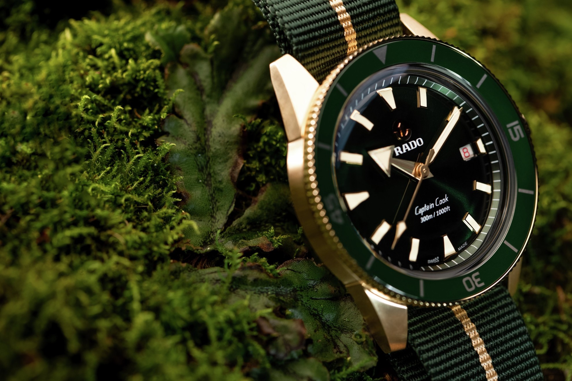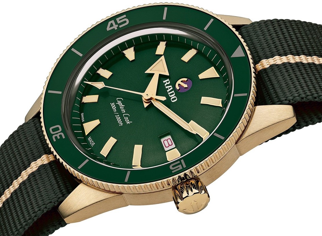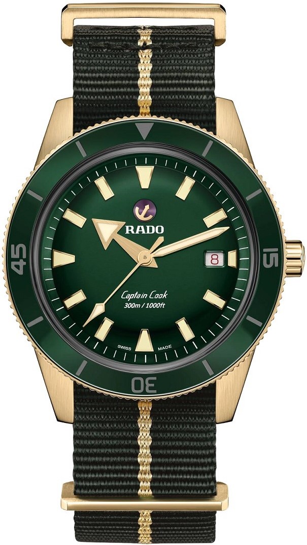 Rado Captain Cook Bronze R32504317 jsou pánské potápěčské hodinky na zeleném NATO řemínku. Bronzové pouzdro má průměr 42 milimetrů a jednosměrně otočnou lunetu se zelenou keramickou vložkou z materiálu High-Tech Ceramic. Zelený gradientní číselník s datumovkou na pozici 3. hodiny je chráněn vypouklým safírovým sklem s oboustrannou antireflexní vrstvou. Aplikované hodinové indexy jsou stejně jako ručky pokryty luminiscenčním nátěrem Super-LumiNova®, který po nasvícení garantuje perfektní čitelnost za zhoršených světelných podmínek.Pohon hodinek zajišťuje mechanický strojek R763 (03.763.935) s automatickým nátahem a rezervou chodu 80 hodin. Tento strojek s funkcí hackingu (zastavení vteřinové ručky při vytažení korunky do krajní polohy) je možné v případě potřeby natahovat i ručně. Díky použití antimagnetického vlásku setrvačky Nivachron™ z titanové slitiny, na jehož vývoji se spolu se Swatch Group podílela manufaktura Audemars Piguet, je tento kalibr vysoce odolný vůči vlivům magnetického pole. Pro dosažení co nejvyšší možné přesnosti je stroj testován v pěti pozicích. Hodinky disponují šroubovací korunkou a vysokou vodotěsností 300 metrů, jsou tedy vhodnou volbou pro hlubinné potápění. Díky systému EasyClip pro snadnou výměnu řemínku, lze jednoduchým způsobem měnit jejich vzhled.