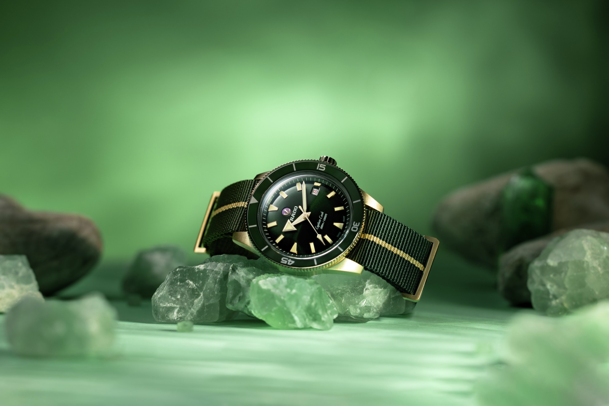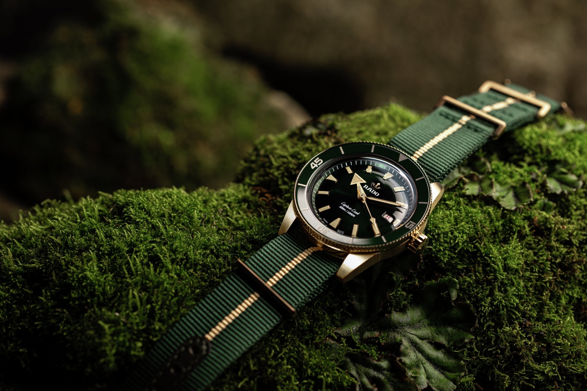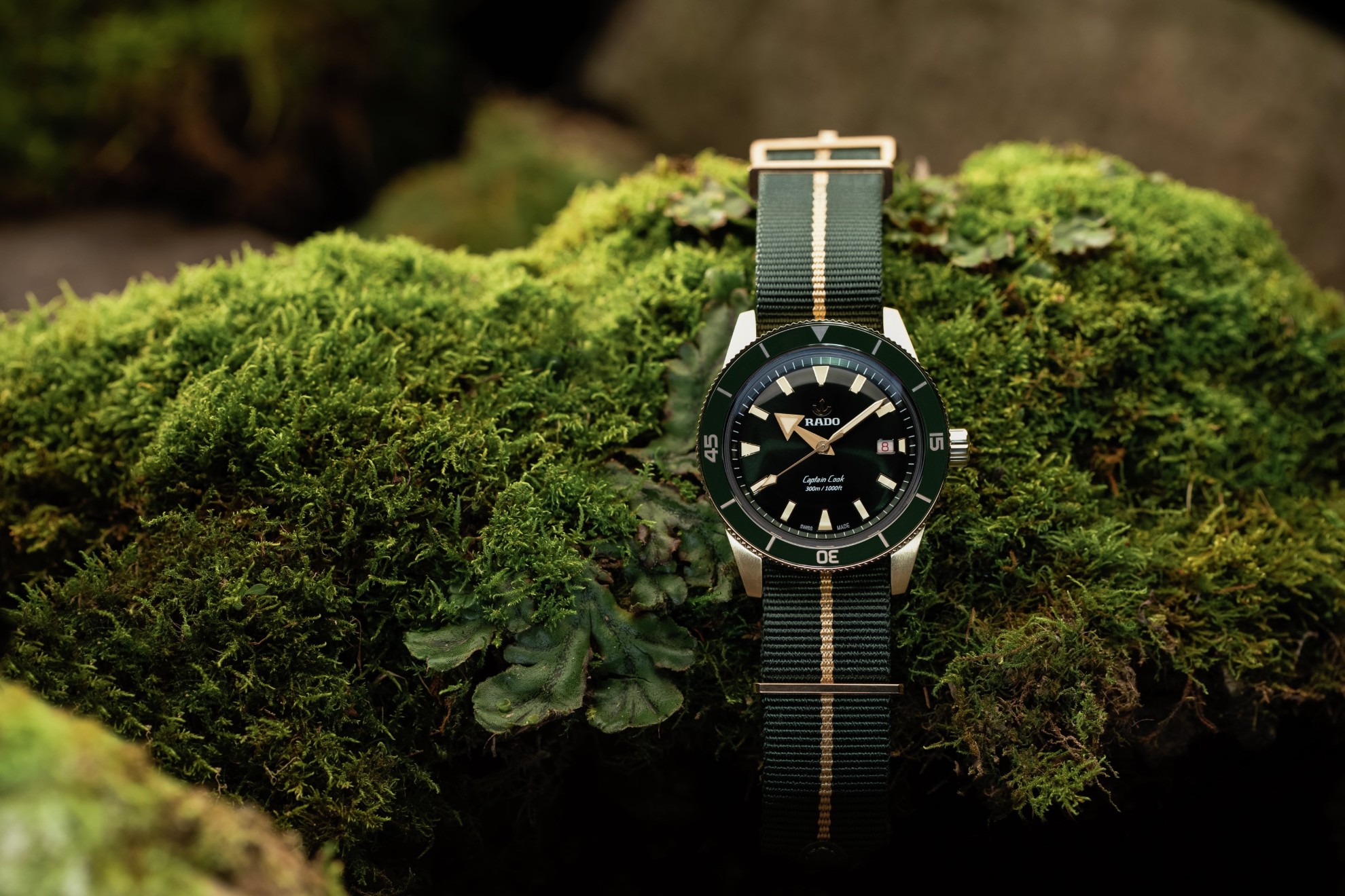 Rado Captain Cook Bronze R32504317 jsou pánské potápěčské hodinky na zeleném NATO řemínku. Bronzové pouzdro má průměr 42 milimetrů a jednosměrně otočnou lunetu se zelenou keramickou vložkou z materiálu High-Tech Ceramic. Zelený gradientní číselník s datumovkou na pozici 3. hodiny je chráněn vypouklým safírovým sklem s oboustrannou antireflexní vrstvou. Aplikované hodinové indexy jsou stejně jako ručky pokryty luminiscenčním nátěrem Super-LumiNova®, který po nasvícení garantuje perfektní čitelnost za zhoršených světelných podmínek.Pohon hodinek zajišťuje mechanický strojek R763 (03.763.935) s automatickým nátahem a rezervou chodu 80 hodin. Tento strojek s funkcí hackingu (zastavení vteřinové ručky při vytažení korunky do krajní polohy) je možné v případě potřeby natahovat i ručně. Díky použití antimagnetického vlásku setrvačky Nivachron™ z titanové slitiny, na jehož vývoji se spolu se Swatch Group podílela manufaktura Audemars Piguet, je tento kalibr vysoce odolný vůči vlivům magnetického pole. Pro dosažení co nejvyšší možné přesnosti je stroj testován v pěti pozicích. Hodinky disponují šroubovací korunkou a vysokou vodotěsností 300 metrů, jsou tedy vhodnou volbou pro hlubinné potápění. Díky systému EasyClip pro snadnou výměnu řemínku, lze jednoduchým způsobem měnit jejich vzhled.