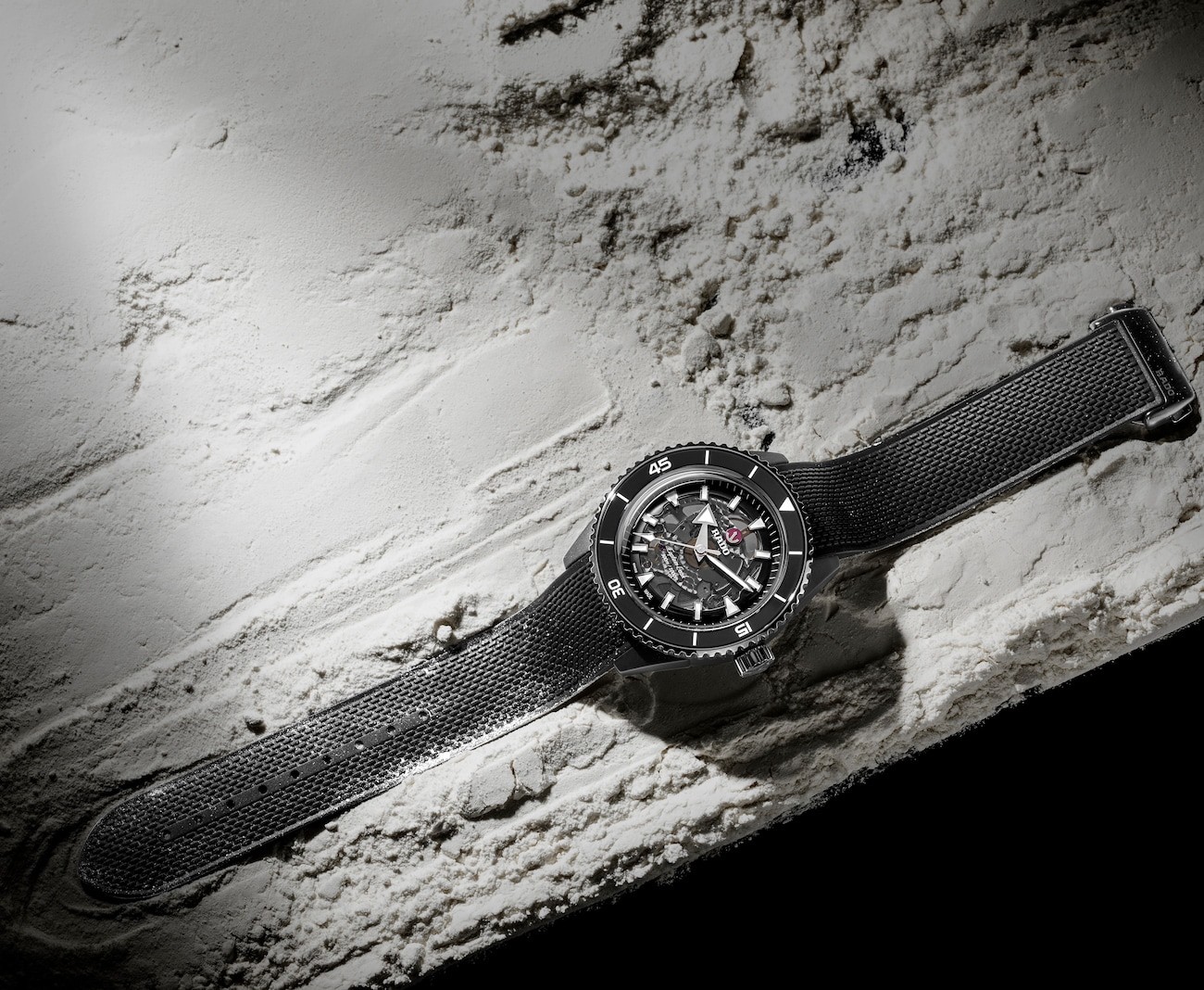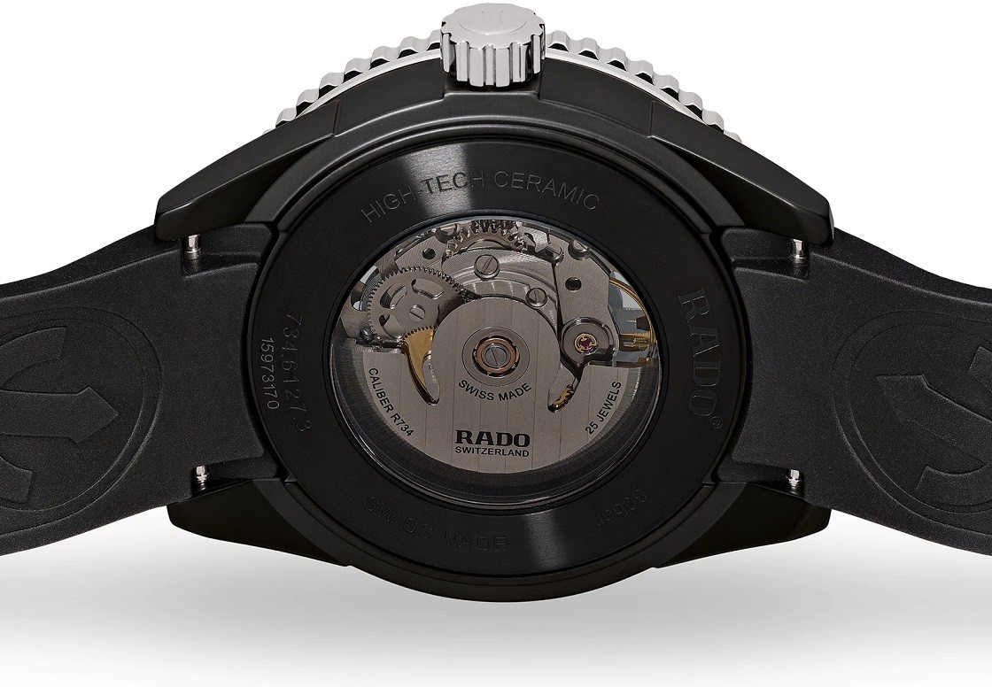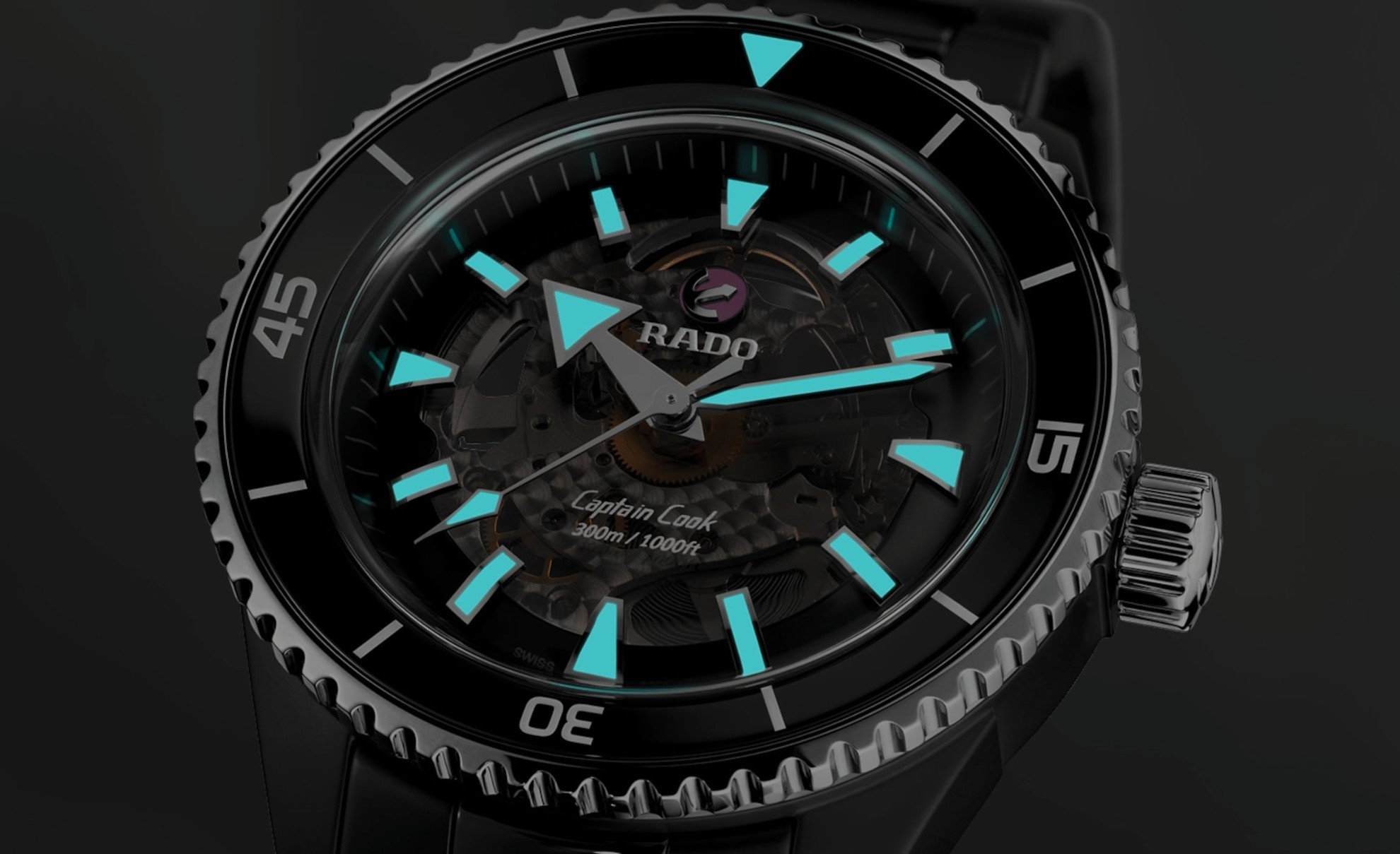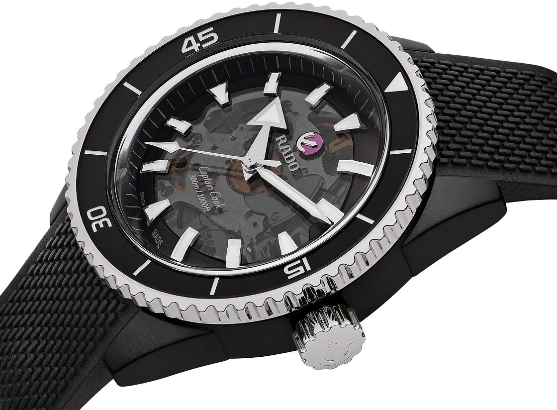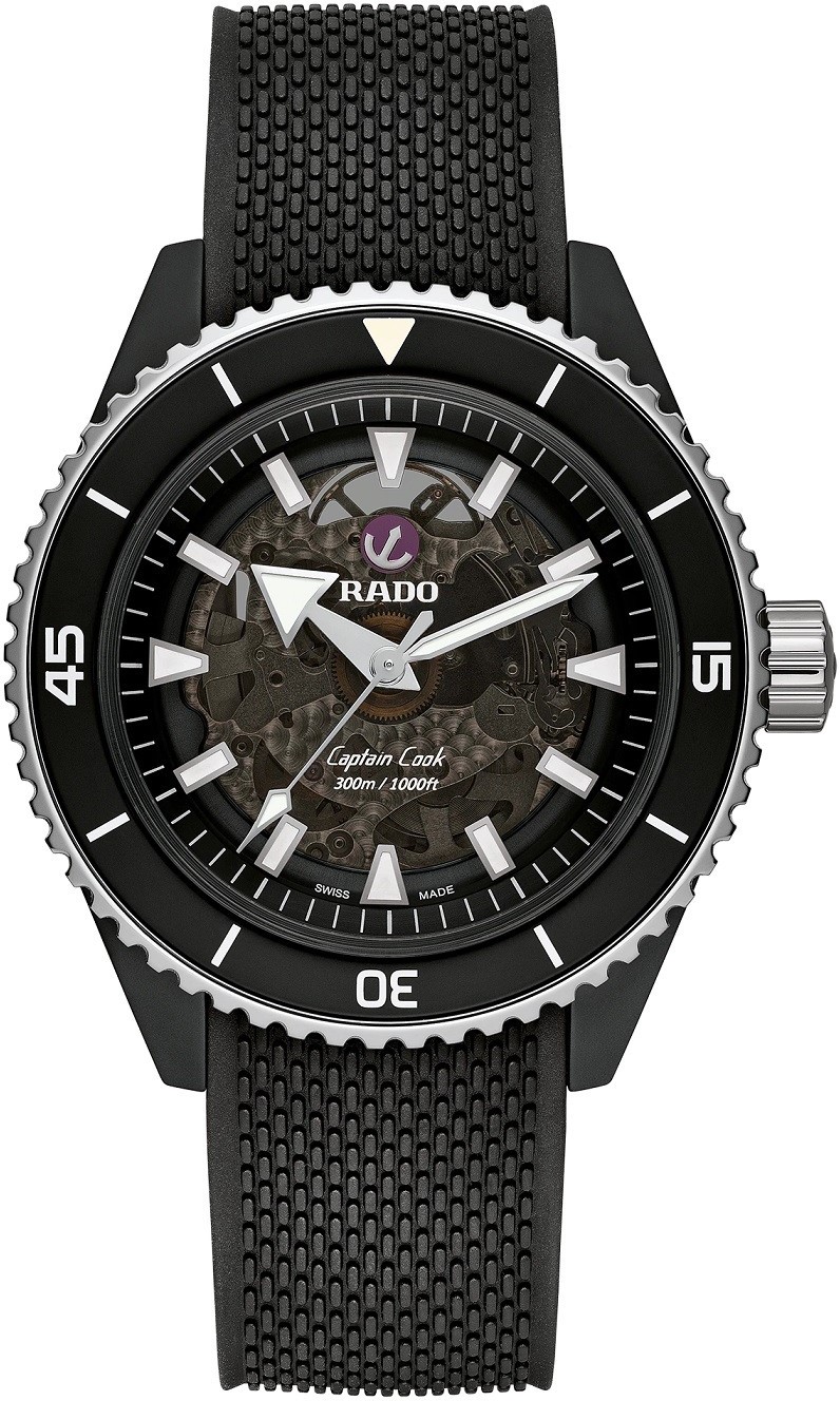 Rado Captain Cook High-Tech Ceramic Skeleton R32127156 jsou pánské potápěčské hodinky na kaučukovém řemínku s překlápěcí sponou. Černé monoblokové pouzdro vyrobené z odolného materiálu High-Tech Ceramic v matném provedení má průměr 43 milimetrů. Ocelová otočná luneta s keramickou vložkou a korunka ve stříbrné barvě ladí s ručkami a indexy, které jsou pro lepší čitelnost za zhoršených světelných podmínek potaženy luminiscenční vrstvou Super-LumiNova®. Transparentní číselník chráněný safírovým sklem s antireflexní vrstvou a průhledné dýnko odhalují inovativní skeletonizovaný kalibr Rado R734 (03.734.731) zdobený ženevskými pruhy. Tento mechanický strojek s automatickým nátahem a rezervou chodu 80 hodin disponuje funkcí hackingu (zastavení vteřinové ručky při vytažení korunky do krajní polohy) a je možné ho v případě potřeby natahovat i ručně. Díky použití antimagnetického vlásku setrvačky Nivachron™ z titanové slitiny je tento kalibr vysoce odolný vůči vlivům magnetického pole. Pro dosažení co nejvyšší možné přesnosti je stroj testován v pěti pozicích. Hodinky disponují šroubovací korunkou a vodotěsností 30 ATM, jsou tedy vhodné pro hlubinné potápění.