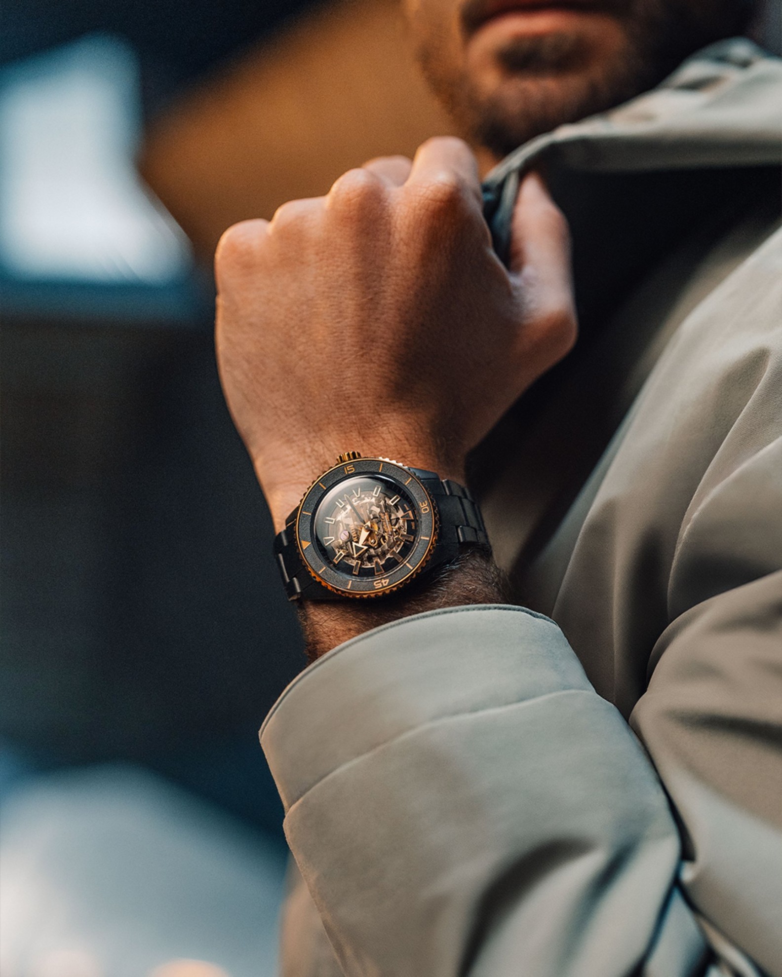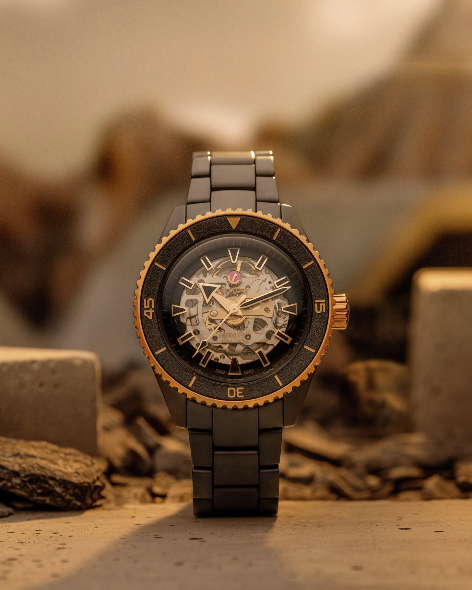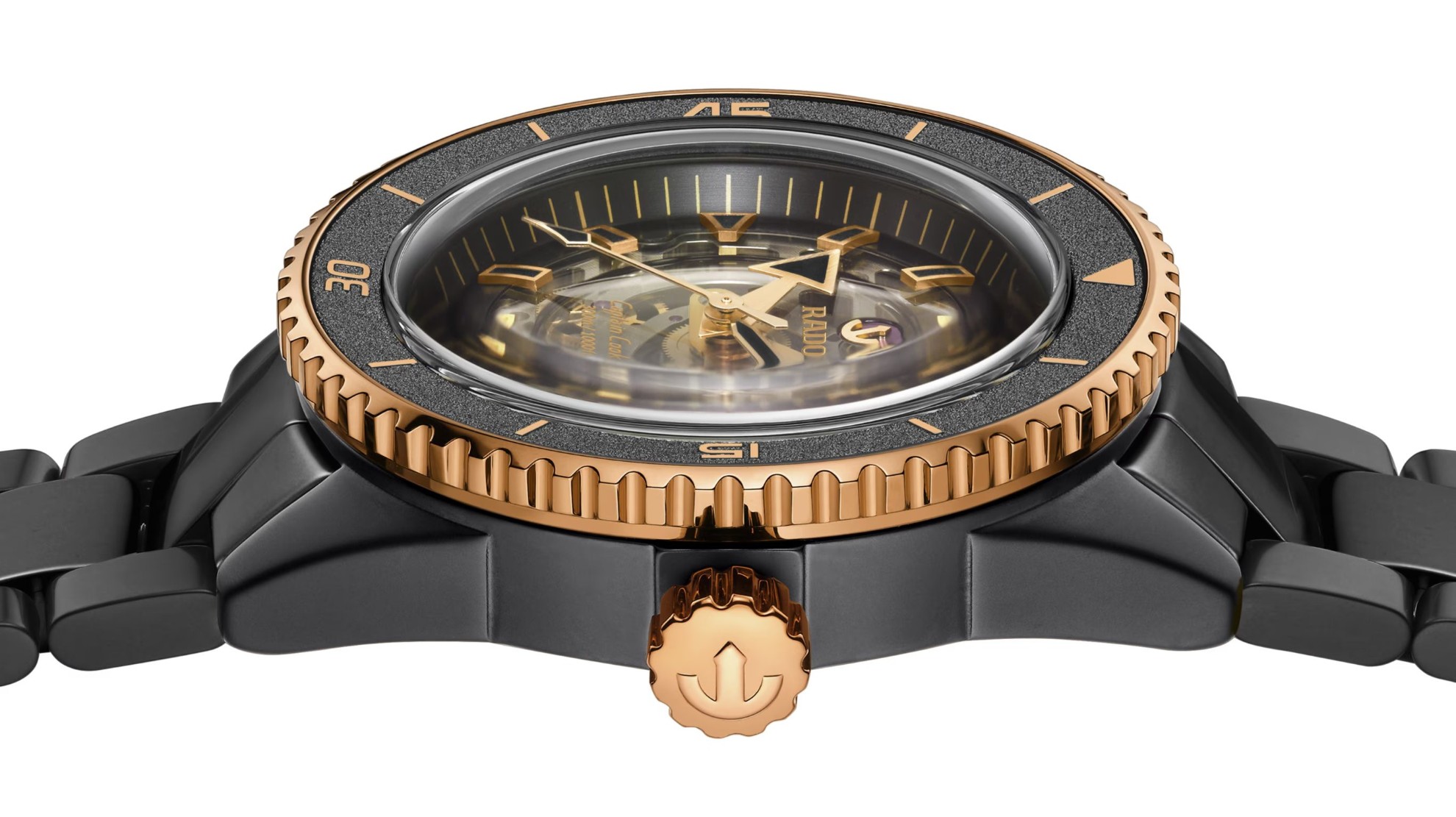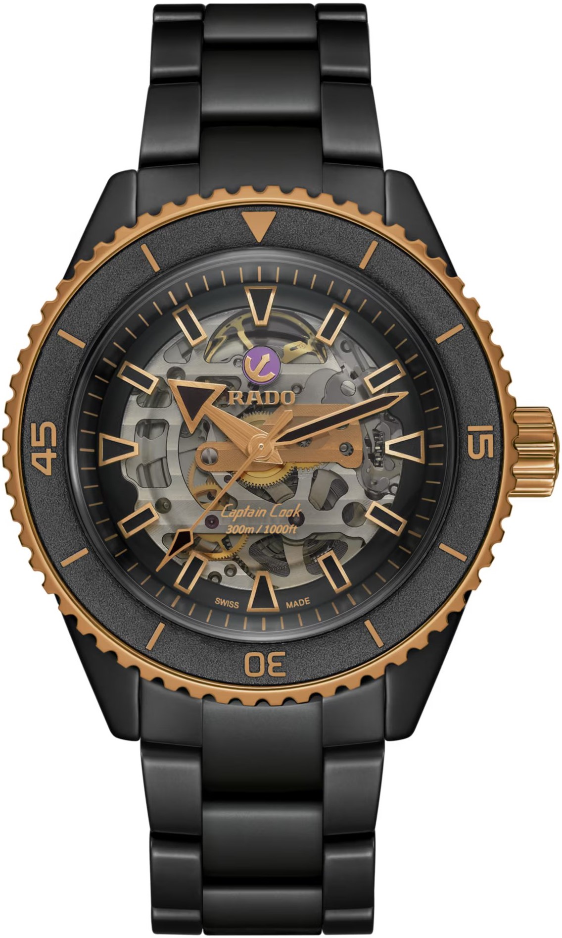 Rado Captain Cook High-Tech Ceramic Skeleton R32192152 jsou pánské potápěčské hodinky s automatickým strojkem. Černé monoblokové keramické pouzdro má průměr 43 milimetrů a je stejně jako náramek vyrobeno z odolného materiálu High-Tech Ceramic v matném provedení. Díky tomuto materiálu jsou hodinky lehké, hypoalergenní a odolné vůči poškrábání. Indexy, ručky, korunka a otočná luneta s keramickou vložkou s detaily v barvě růžového zlata kontrastují s pouzdrem a náramkem v černém provedení. Safírové sklo je ošetřeno antireflexní vrstvou z obou stran. Transparentní číselník i zadní dýnko odhaluje kalibr R808 (03.808.260). Tento mechanický strojek s automatickým nátahem a rezervou chodu 80 hodin disponuje funkcí hackingu (zastavení vteřinové ručky při vytažení korunky do krajní polohy) a je možné ho v případě potřeby natahovat i ručně. Díky použití antimagnetického vlásku setrvačky Nivachron™ z titanové slitiny, na jehož vývoji se spolu se Swatch Group podílela manufaktura Audemars Piguet, je tento kalibr vysoce odolný vůči vlivům magnetického pole. Pro dosažení co nejvyšší možné přesnosti je stroj testován v pěti pozicích. Hodinky disponují vysokou vodotěsností 300 metrů a jsou tedy vhodné pro hlubinné potápění.