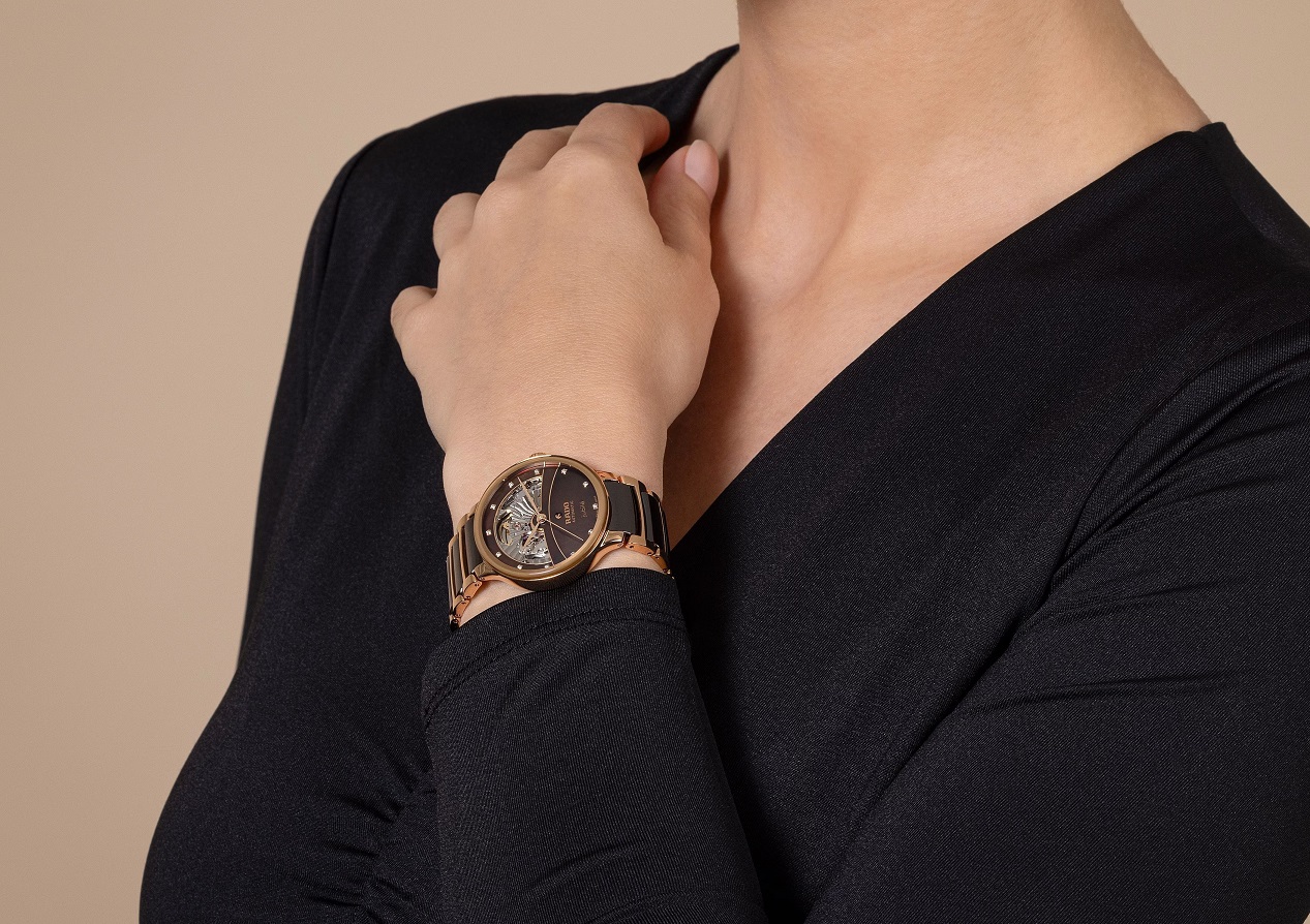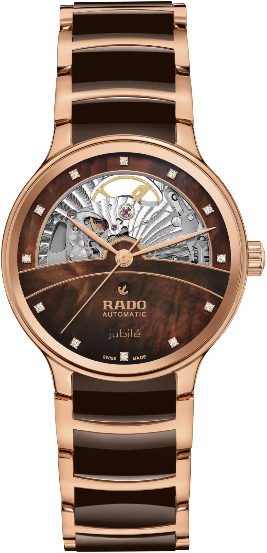 Rado Centrix Automatic Diamonds Open Heart R30029902 jsou dámské automatické hodinky elegantního stylu s leštěným ocelovým pouzdrem o průměru 35 milimetrů. Náramek tvoří kombinace keramického materiálu High-Tech Ceramic a oceli s motýlkovou sponou. Pouzdro s korunkou a ocelové části náramku jsou opatřeny PVD úpravou v barvě růžového zlata. Hnědý perleťový částečně skeletonový číselník zdobí 12 diamantů a jeho krása vyniká zejména pod přímým světlem, kdy můžeme pozorovat hru barev perleti. Je chráněn tzv. „edge to edge“ safírovým sklem s antireflexní vrstvou a metalizovaným rámečkem, které sahá až k úplnému okraji pouzdra a spolu se safírovým průhledným dýnkem nabízí pohled na mechanický strojek s automatickým nátahem R734 (03.734.532), který je dekorovaný perláží a ženevskými pruhy. Tento strojek s rezervou chodu 80 hodin disponuje funkcí hackingu (zastavení vteřinové ručky při vytažení korunky do krajní polohy) a je možné ho v případě potřeby natahovat i ručně. Díky použití antimagnetického vlásku setrvačky Nivachron™ z titanové slitiny je kalibr vysoce odolný vůči vlivům magnetického pole. Pro dosažení co nejvyšší možné přesnosti je stroj testován v pěti pozicích. Hodinky disponují vodotěsností 5 ATM a jsou tedy odolné proti dešti a při sprchování.
