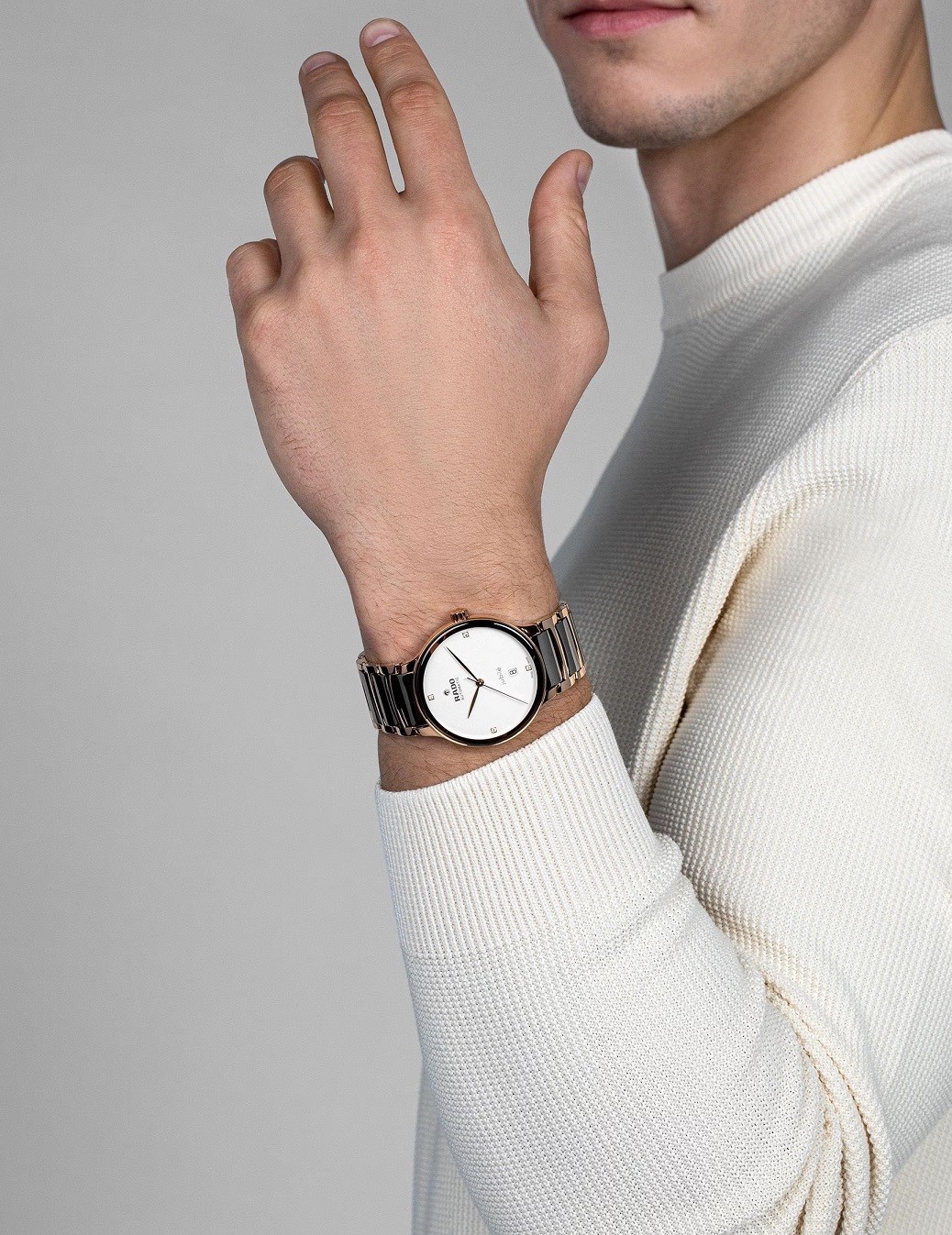 Rado Centrix Automatic Diamonds R30017722 jsou automatické unisex hodinky elegantního stylu s ocelovým pouzdrem o průměru 39,5 milimetru. Náramek tvoří kombinace materiálu Plasma High-Tech Ceramic a oceli. Pouzdro s korunkou a ocelové části náramku jsou ošetřeny PVD úpravou v barvě růžového zlata. Bílý číselník s datumovkou zdobený 4 diamanty Top Wesselton o hmotnosti 0,04 ct a čistotě VS-SI je chráněn tzv. „edge to edge“ safírovým sklem s metalizovaným rámečkem, které sahá až k úplnému okraji pouzdra. Průhledné dýnko umožňuje pohled na automatický kalibr R763 (03.763.241) dekorovaný ženevskými pruhy a perláží. Tento mechanický strojek s automatickým nátahem a rezervou chodu 80 hodin disponuje funkcí hackingu (zastavení vteřinové ručky při vytažení korunky do krajní polohy) a je možné ho v případě potřeby natahovat i ručně. Díky použití antimagnetického vlásku setrvačky Nivachron™ z titanové slitiny je tento kalibr vysoce odolný vůči vlivům magnetického pole. Pro dosažení co nejvyšší možné přesnosti je stroj testován v pěti pozicích. Hodinky disponují vodotěsností 5 ATM a jsou tedy odolné proti dešti a při sprchování.