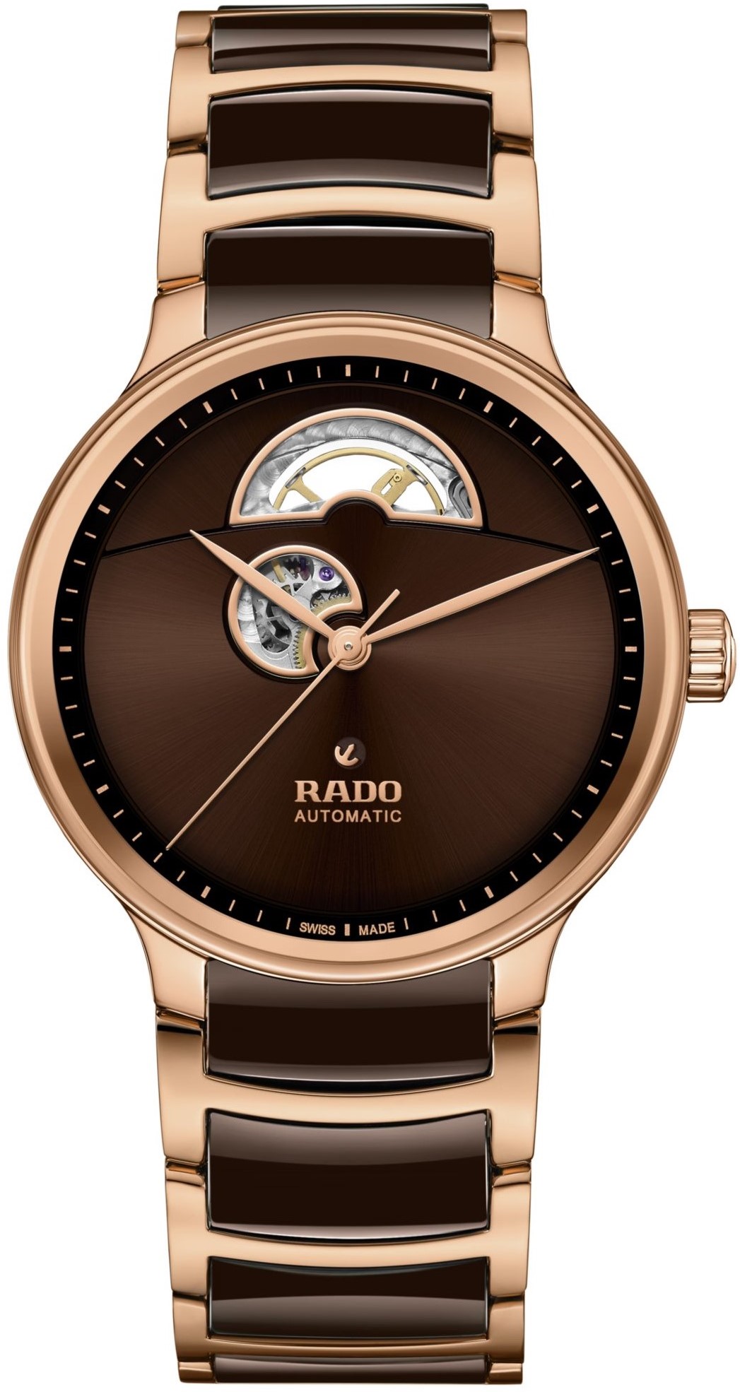 Rado Centrix Automatic Open Heart R30013302 jsou automatické unisex hodinky elegantního stylu s nerezovým pouzdrem o průměru 39,5 milimetru. Náramek tvoří kombinace keramického materiálu High-Tech Ceramic a oceli. Pouzdro s korunkou a ocelové části náramku jsou ošetřeny PVD úpravou v barvě růžového zlata. Hnědý číselník s efektem slunečního brusu nabízí díky komplikaci open heart pohled do samotného srdce mechanického stroje. Číselník chrání tzv. „edge to edge“ safírové sklíčko s oboustrannou antireflexní vrstvou a metalizovaným okrajem, které sahá až k úplnému okraji pouzdra. Průhledné dýnko umožňuje pohled na automatický kalibr R764 (03.734.431), který je dekorovaný perláží a ženevskými pruhy. Tento mechanický strojek s automatickým nátahem a rezervou chodu 80 hodin disponuje funkcí hackingu (zastavení vteřinové ručky při vytažení korunky do krajní polohy) a je možné ho v případě potřeby natahovat i ručně. Díky použití antimagnetického vlásku setrvačky Nivachron™ z titanové slitiny je tento kalibr vysoce odolný vůči vlivům magnetického pole. Pro dosažení co nejvyšší možné přesnosti je stroj testován v pěti pozicích. Hodinky disponují vodotěsností 5 ATM a jsou tedy odolné proti dešti a při sprchování.