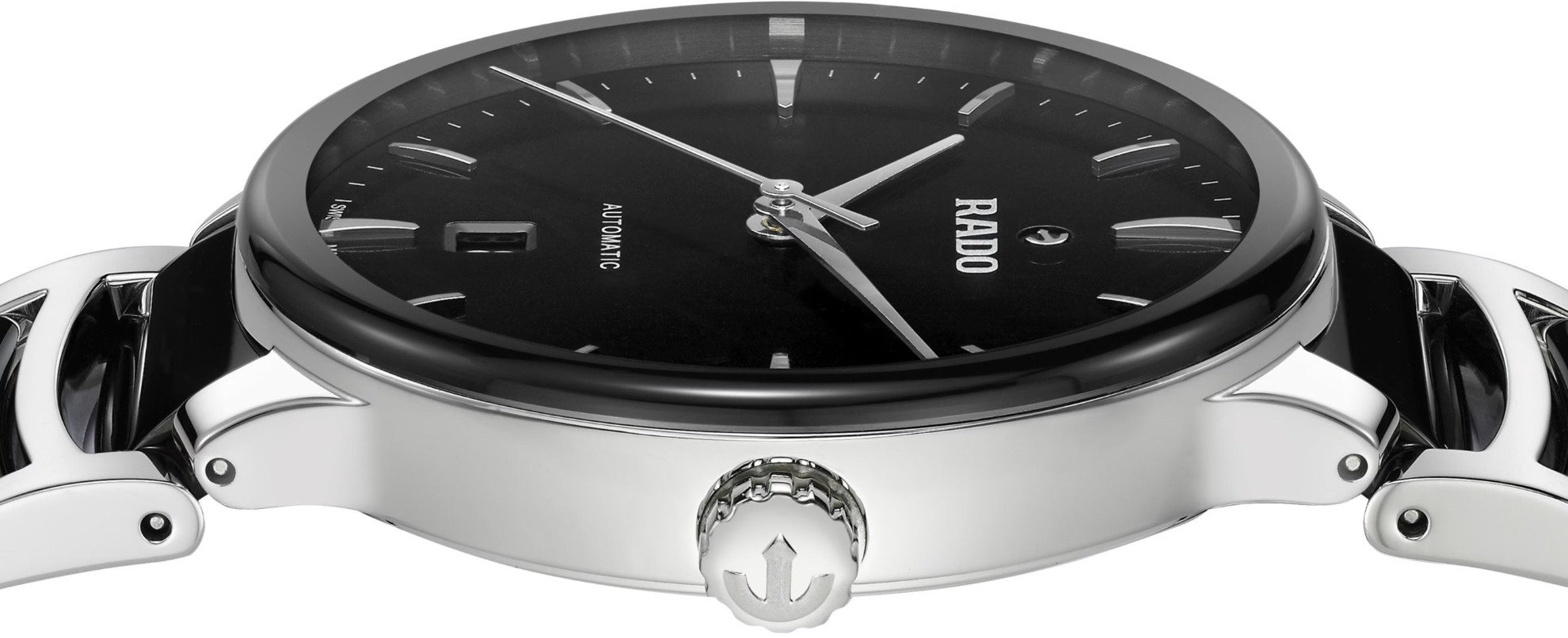 Rado Centrix Automatic R30018152 jsou automatické unisex hodinky elegantního stylu s ocelovým pouzdrem o průměru 39,5 milimetru. Náramek tvoří kombinace materiálu High-Tech Ceramic a oceli. Černý číselník s datumovkou na šesté hodině je chráněn tzv. „edge to edge“ safírovým sklem s metalizovaným rámečkem, které sahá až k úplnému okraji pouzdra. Průhledné dýnko umožňuje pohled na automatický kalibr R763 (03.763.242) dekorovaný ženevskými pruhy a perláží. Tento mechanický strojek s automatickým nátahem a rezervou chodu 80 hodin disponuje funkcí hackingu (zastavení vteřinové ručky při vytažení korunky do krajní polohy) a je možné ho v případě potřeby natahovat i ručně. Díky použití antimagnetického vlásku setrvačky Nivachron™ z titanové slitiny je tento kalibr vysoce odolný vůči vlivům magnetického pole. Pro dosažení co nejvyšší možné přesnosti je stroj testován v pěti pozicích. Hodinky disponují vodotěsností 5 ATM a jsou tedy odolné proti dešti a při sprchování.