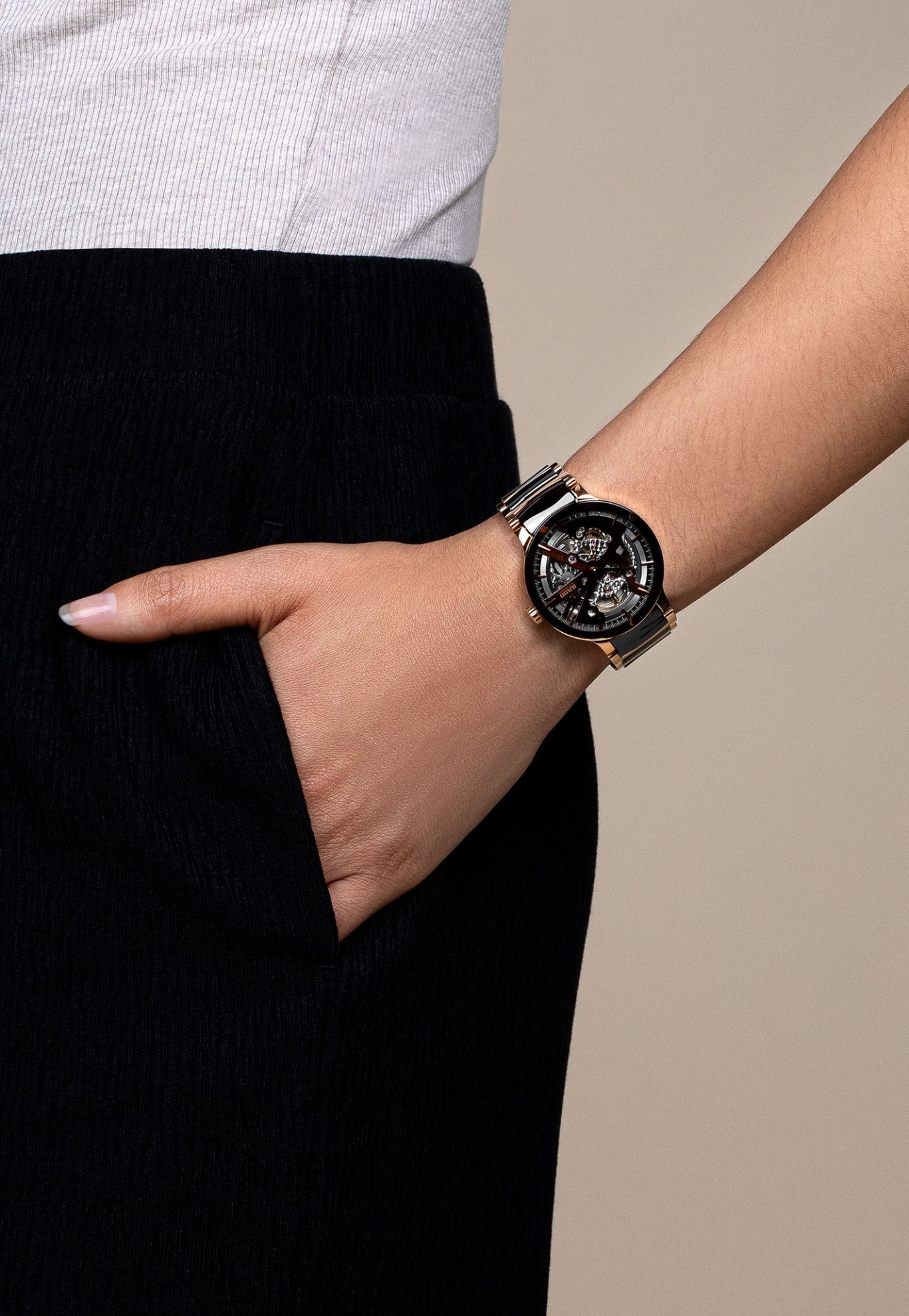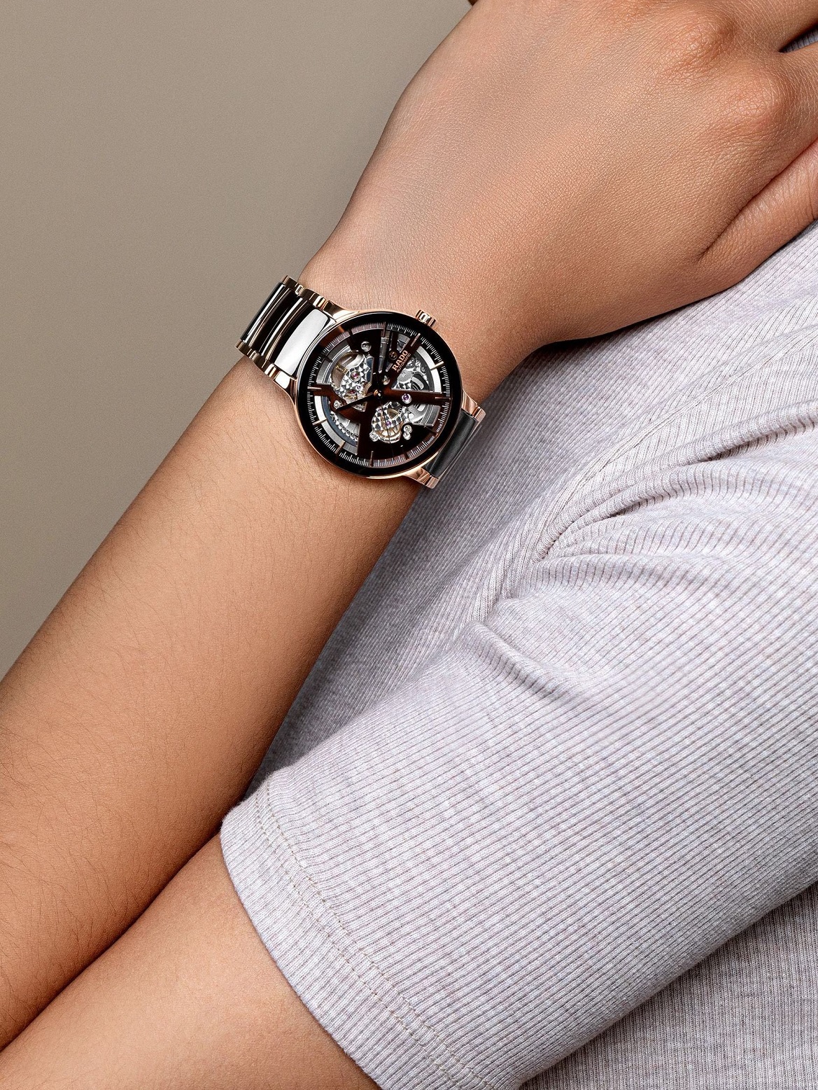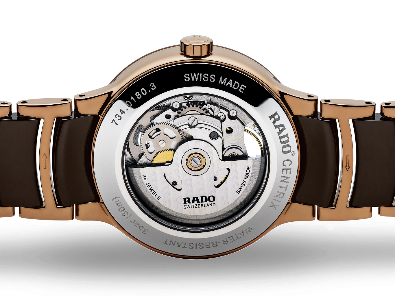 Rado Centrix R30181312 jsou automatické unisex hodinky elegantního stylu s leštěným ocelovým pouzdrem o průměru 38 milimetrů. Náramek tvoří kombinace keramického materiálu High-Tech Ceramic a oceli s titanovou motýlkovou sponou. Pouzdro s korunkou a ocelové části náramku jsou opatřeny PVD úpravou v barvě růžového zlata. Hnědý skeletonový číselník je chráněn tzv. „edge to edge“ safírovým sklem s metalizovaným rámečkem, které sahá až k úplnému okraji pouzdra. Spolu se safírovým průhledným dýnkem nabízí pohled na mechanický strojek s automatickým nátahem R734 (03.734.431), který je dekorovaný perláží a ženevskými pruhy. Tento strojek s rezervou chodu 80 hodin disponuje funkcí hackingu (zastavení vteřinové ručky při vytažení korunky do krajní polohy) a je možné ho v případě potřeby natahovat i ručně. Díky použití antimagnetického vlásku setrvačky Nivachron™ z titanové slitiny je kalibr vysoce odolný vůči vlivům magnetického pole. Pro dosažení co nejvyšší možné přesnosti je stroj testován v pěti pozicích. Hodinky disponují vodotěsností 3 ATM a jsou tedy odolné proti vlhkosti, dešti a při mytí rukou.