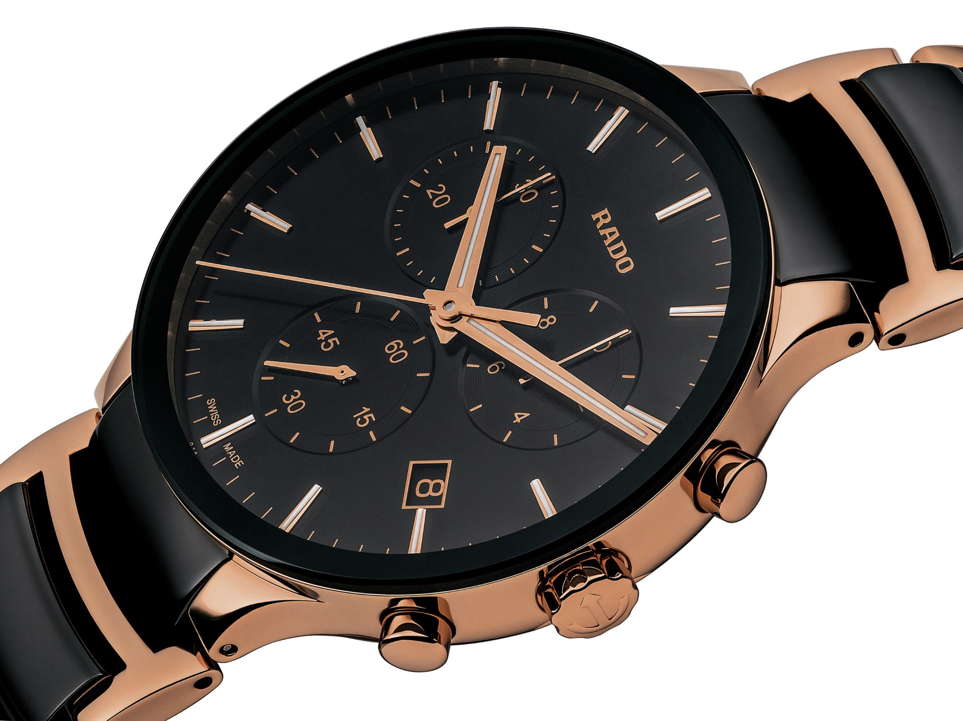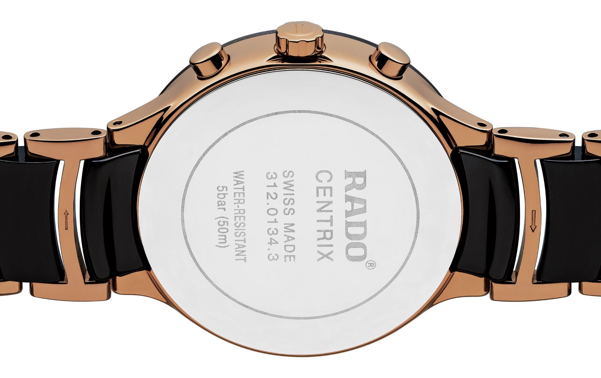 Rado Centrix Chronograph R30187172 jsou pánské bateriové hodinky v elegantně-sportovním stylu s nerezovým pouzdrem o průměru 40 milimetrů. Náramek tvoří kombinace keramického materiálu High-Tech Ceramic s ocelí a titanovou překlápěcí sponou. Ocelové části náramku a pouzdro s korunkou a tlačítky chronografu jsou ošetřeny PVD úpravou v barvě růžového zlata. Černý číselník s datumovkou na čtvrté hodině, chronografem a průběžnou vteřinovou ručkou je chráněn tzv. „edge to edge“ safírovým sklem s metalizovaným rámečkem, které sahá až k úplnému okraji pouzdra. Ručičky a aplikované indexy jsou potaženy luminiscenční vrstvou Super-LumiNova® pro lepší čitelnost i za zhoršených světelných podmínek. Pohon zajišťuje švýcarský quartzový strojek. Hodinky disponují vodotěsností 5 ATM a jsou tedy odolné proti dešti a při sprchování.