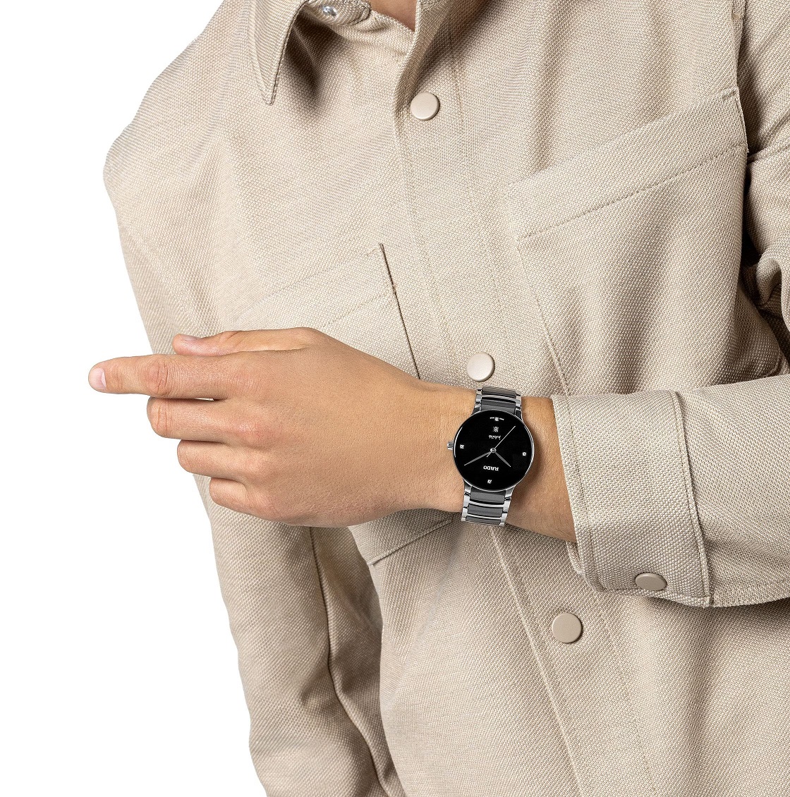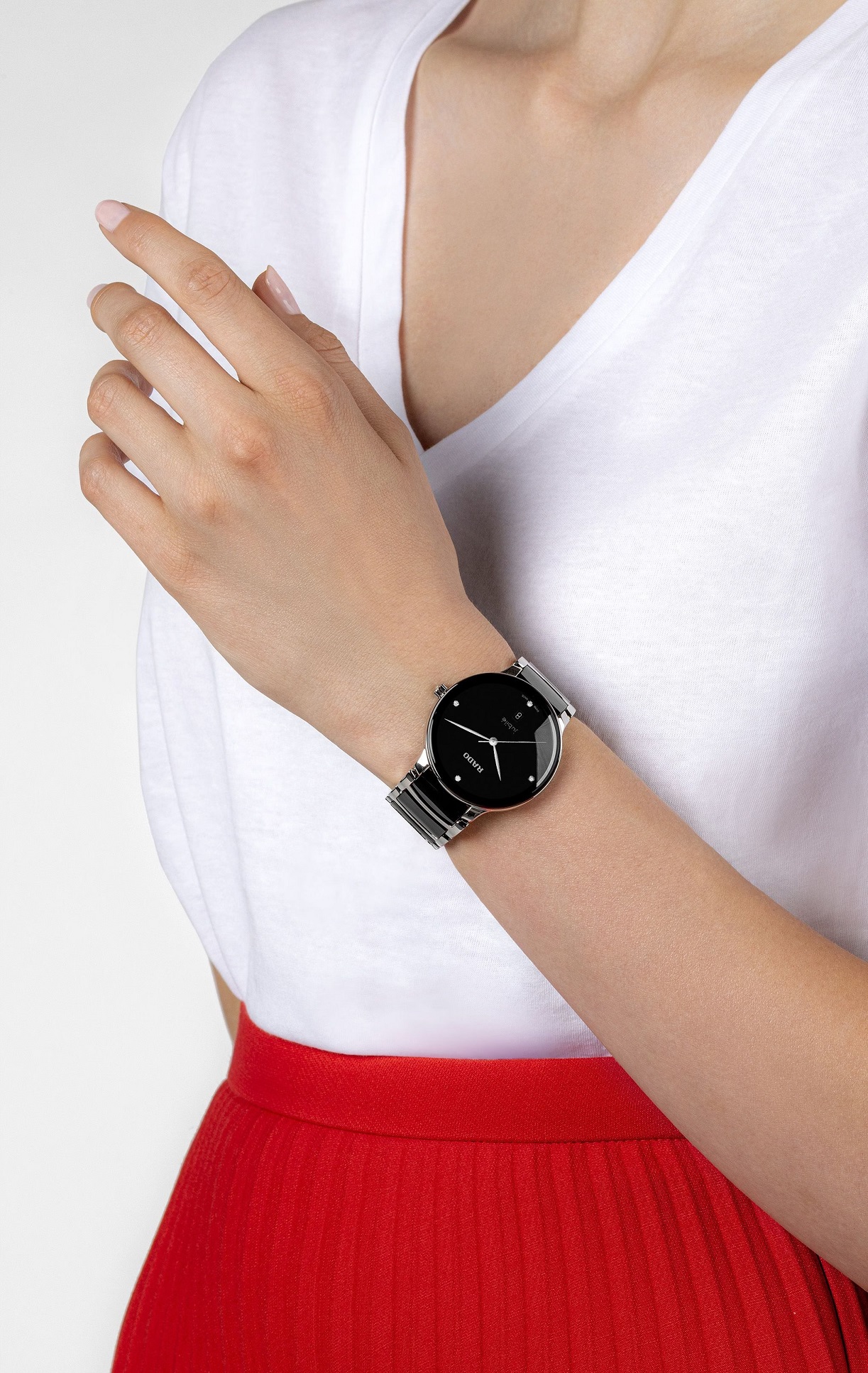 Rado Centrix Diamonds R30021712 jsou bateriové unisex hodinky elegantního stylu s ocelovým pouzdrem o průměru 39,5 milimetru. Náramek tvoří kombinace materiálu High-Tech Ceramic a oceli. Černý číselník s datumovkou zdobený 4 diamanty je chráněn tzv. „edge to edge“ safírovým sklem s metalizovaným rámečkem, které sahá až k úplnému okraji pouzdra. Pohon hodinek zajištuje švýcarský quartzový strojek. Hodinky disponují vodotěsností 5 ATM a jsou tedy odolné proti dešti a při sprchování.