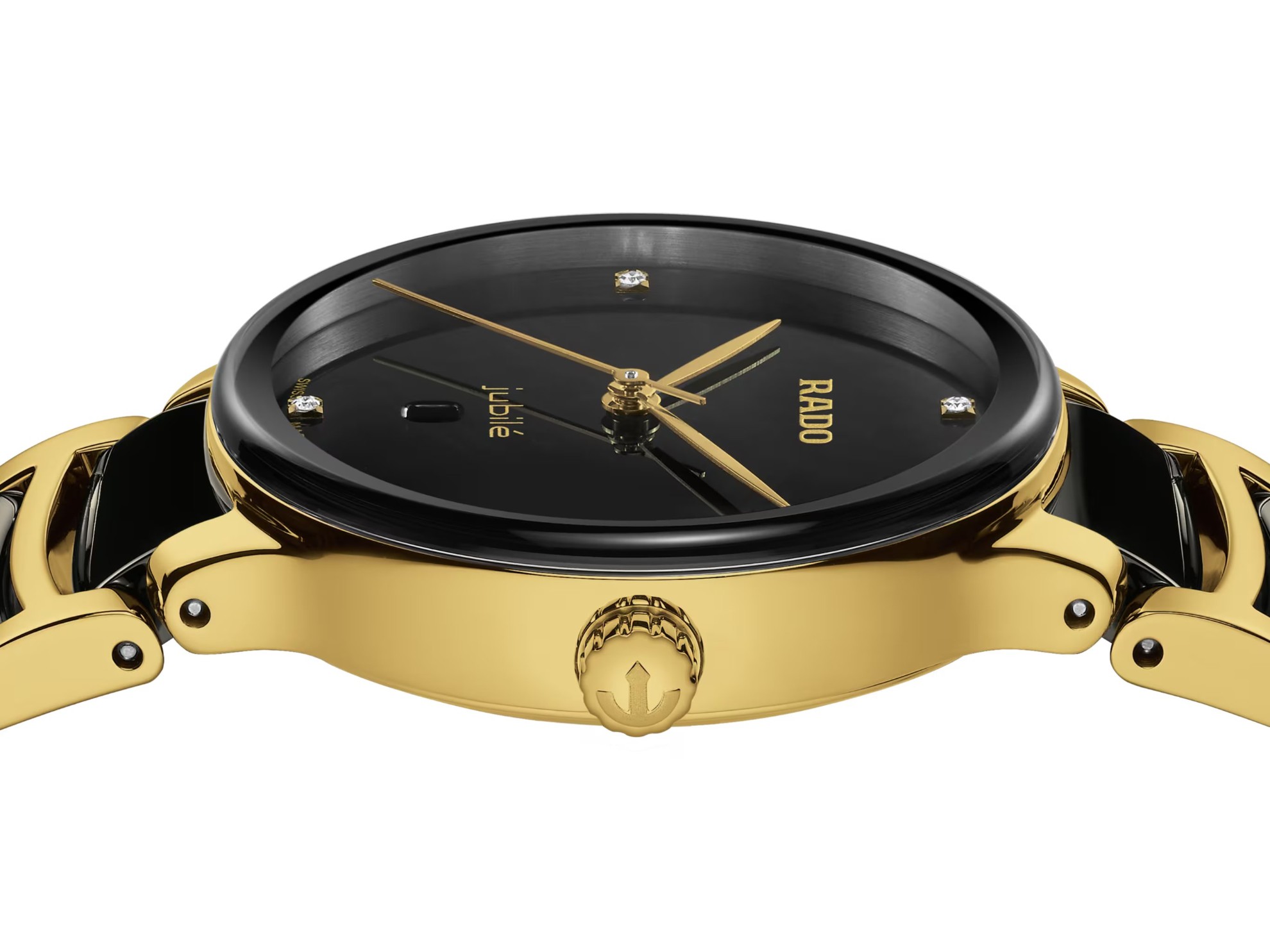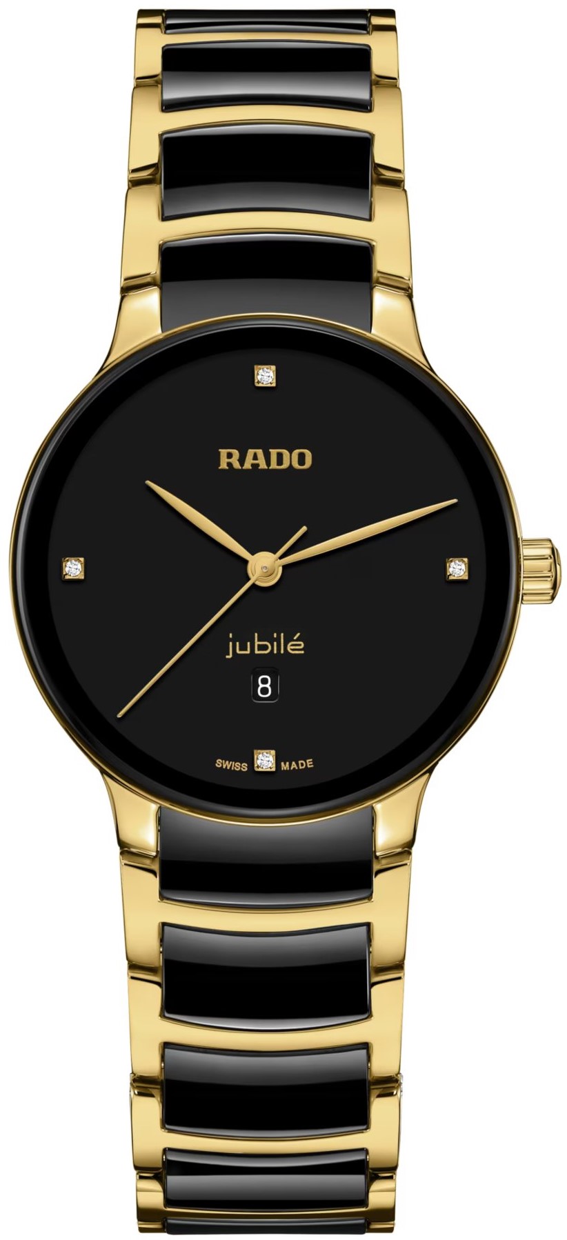 Rado Centrix R30025712 jsou dámské bateriové hodinky elegantního stylu s ocelovým pouzdrem o průměru 30,5 milimetru. Náramek tvoří kombinace materiálu High-Tech Ceramic a oceli. Pouzdro s korunkou a ocelové části náramku jsou ošetřeny PVD úpravou ve zlaté barvě. Černý číselník s datumovkou na šesté hodině zdobený 4 diamanty je chráněn tzv. „edge to edge“ safírovým sklem s metalizovaným rámečkem, které sahá až k úplnému okraji pouzdra. Pohon hodinek zajištuje švýcarský quartzový strojek. Hodinky disponují vodotěsností 5 ATM a jsou tedy odolné proti dešti a při sprchování.