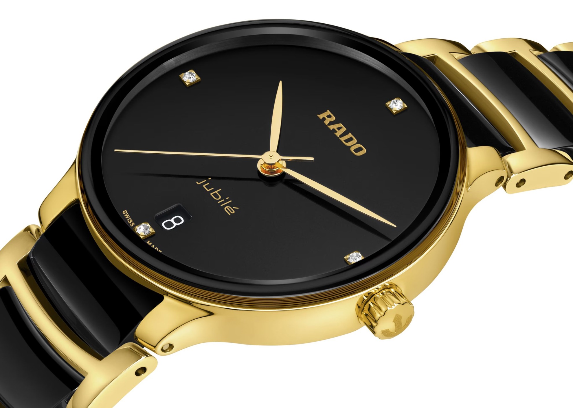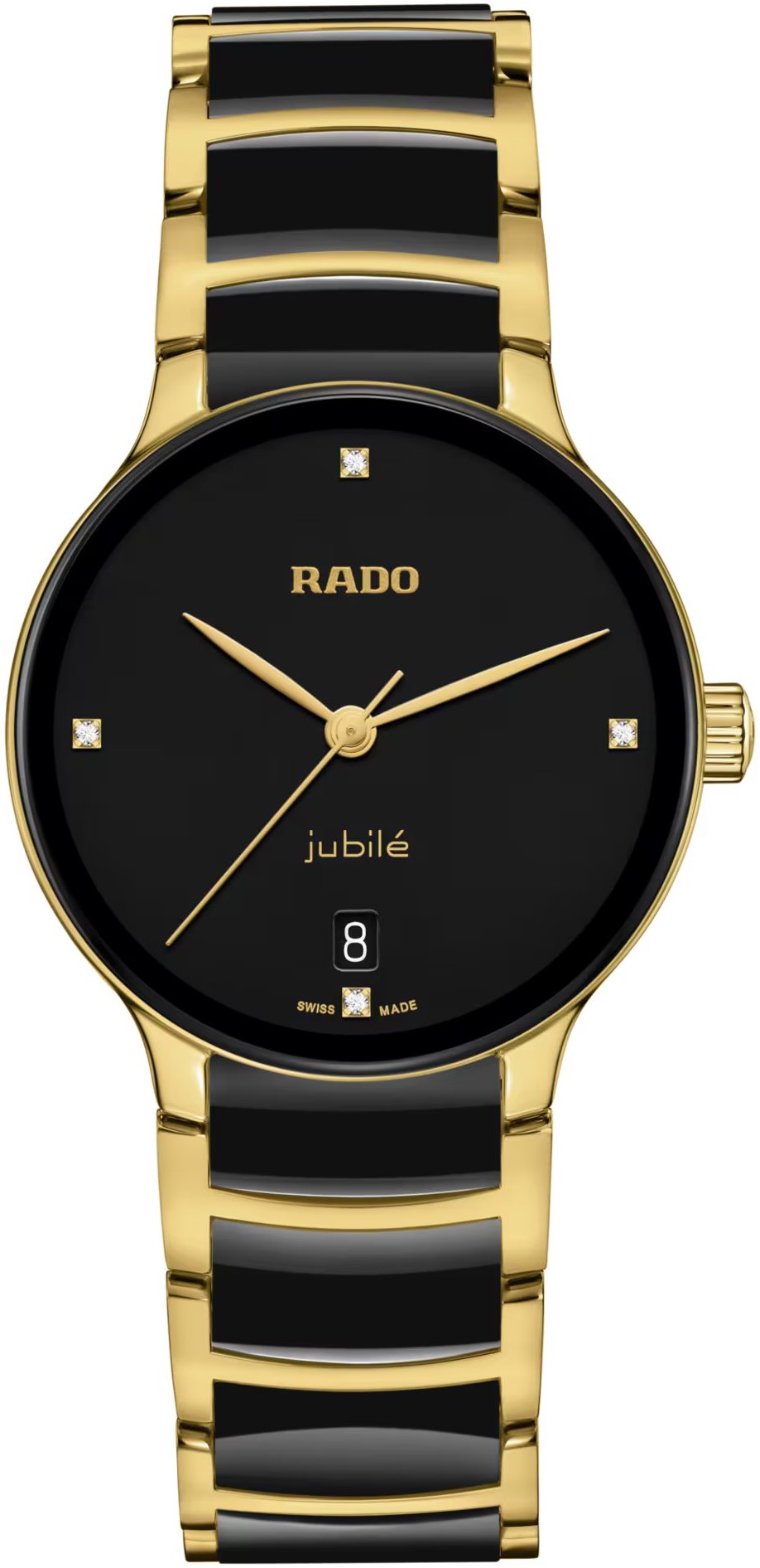 Rado Centrix Diamonds R30039712 jsou dámské bateriové hodinky elegantního stylu s ocelovým pouzdrem o průměru 35 milimetrů. Náramek tvoří kombinace materiálu High-Tech Ceramic a oceli s PVD úpravou zlaté barvy. Černý číselník s datumovkou na šesté hodině zdobený 4 diamanty je chráněn tzv. „edge to edge“ safírovým sklem s metalizovaným rámečkem, které sahá až k úplnému okraji pouzdra. Pohon hodinek zajištuje švýcarský quartzový strojek R073. Hodinky disponují vodotěsností 5 ATM a jsou tedy odolné proti dešti a při sprchování.