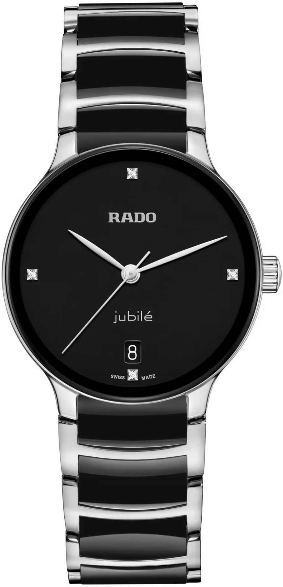 Rado Centrix Diamonds R30040712 jsou dámské bateriové hodinky elegantního stylu s ocelovým pouzdrem o průměru 35 milimetrů. Náramek tvoří kombinace materiálu High-Tech Ceramic a oceli. Černý číselník s datumovkou na šesté hodině zdobený 4 diamanty je chráněn tzv. „edge to edge“ safírovým sklem s metalizovaným rámečkem, které sahá až k úplnému okraji pouzdra. Pohon hodinek zajištuje švýcarský quartzový strojek R073. Hodinky disponují vodotěsností 5 ATM a jsou tedy odolné proti dešti a při sprchování.