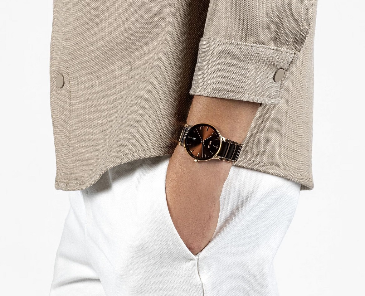 Rado Centrix R30023302 jsou bateriové unisex hodinky elegantního stylu s ocelovým pouzdrem o průměru 39,5 milimetru. Náramek tvoří kombinace materiálu High-Tech Ceramic a oceli. Pouzdro s korunkou a ocelové části náramku jsou ošetřeny PVD úpravou v barvě růžového zlata. Hnědý číselník s datumovkou na šesté hodině a efektem slunečního brusu je chráněn tzv. „edge to edge“ safírovým sklem s metalizovaným rámečkem, které sahá až k úplnému okraji pouzdra. Pohon hodinek zajištuje švýcarský quartzový strojek. Hodinky disponují vodotěsností 5 ATM a jsou tedy odolné proti dešti a při sprchování.