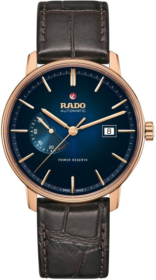 Rado Coupole Classic Automatic Power Reserve R22879215 jsou pánské elegantní automatické hodinky na hnědém koženém řemínku s překlápěcí sponou. Pouzdro s PVD úpravou v barvě růžového zlata má průměr 41 milimetrů. Modrý gradientní číselník s ukazatelem data a rezervy nátahu je chráněn safírovým sklíčkem s oboustrannou antireflexní vrstvou. Průhledné dýnko umožňuje pohled na mechanický strojek dekorovaný ženevskými pruhy a perláží. Tento mechanický strojek R772 (03.772.214) s automatickým nátahem a rezervou chodu 80 hodin disponuje funkcí hackingu (zastavení vteřinové ručky při vytažení korunky do krajní polohy) a je možné ho v případě potřeby natahovat i ručně. Díky použití antimagnetického vlásku setrvačky Nivachron™ z titanové slitiny je vysoce odolný vůči vlivům magnetického pole. Pro dosažení co nejvyšší možné přesnosti je stroj testován v pěti pozicích. S vodotěsností 5 ATM jsou hodinky odolné proti dešti a při sprchování.