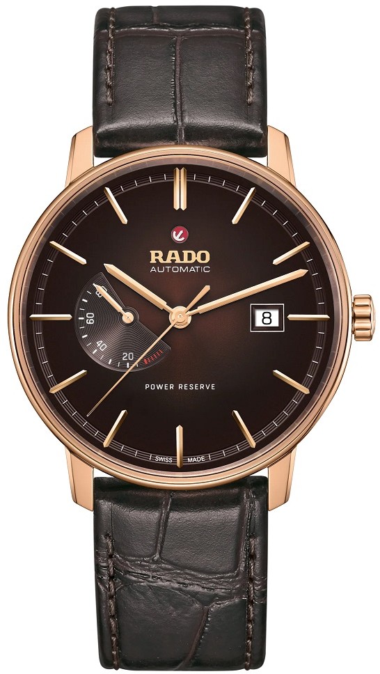 Rado Coupole Classic Automatic Power Reserve R22879325 jsou pánské elegantní automatické hodinky na hnědém koženém řemínku s překlápěcí sponou. Pouzdro s PVD úpravou v barvě růžového zlata má průměr 41 milimetrů. Hnědý gradientní číselník s ukazatelem data a rezervy nátahu je chráněn safírovým sklíčkem s oboustrannou antireflexní vrstvou. Průhledné dýnko umožňuje pohled na mechanický strojek dekorovaný ženevskými pruhy a perláží. Tento mechanický strojek R772 (03.772.214) s automatickým nátahem a rezervou chodu 80 hodin disponuje funkcí hackingu (zastavení vteřinové ručky při vytažení korunky do krajní polohy) a je možné ho v případě potřeby natahovat i ručně. Díky použití antimagnetického vlásku setrvačky Nivachron™ z titanové slitiny je vysoce odolný vůči vlivům magnetického pole. Pro dosažení co nejvyšší možné přesnosti je stroj testován v pěti pozicích. S vodotěsností 5 ATM jsou hodinky odolné proti dešti a při sprchování.