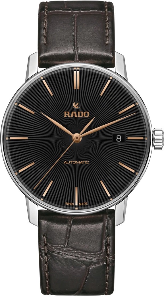 Rado Coupole Classic Automatic R22860165 jsou pánské elegantní automatické hodinky na hnědém koženém řemínku s průměrem pouzdra 37,7 milimetru. Černý fazetovaný číselník s datumovkou na třetí hodině je chráněn safírovým sklíčkem s oboustrannou antireflexní vrstvou. Průhledné dýnko umožňuje pohled na mechanický strojek dekorovaný ženevskými pruhy. Tento mechanický strojek R763 (03.763.438) s automatickým nátahem a rezervou chodu 80 hodin disponuje funkcí hackingu (zastavení vteřinové ručky při vytažení korunky do krajní polohy) a je možné ho v případě potřeby natahovat i ručně. Díky použití antimagnetického vlásku setrvačky Nivachron™ z titanové slitiny je vysoce odolný vůči vlivům magnetického pole. Pro dosažení co nejvyšší možné přesnosti je stroj testován v pěti pozicích. S vodotěsností 5 ATM jsou hodinky odolné proti dešti a při sprchování.