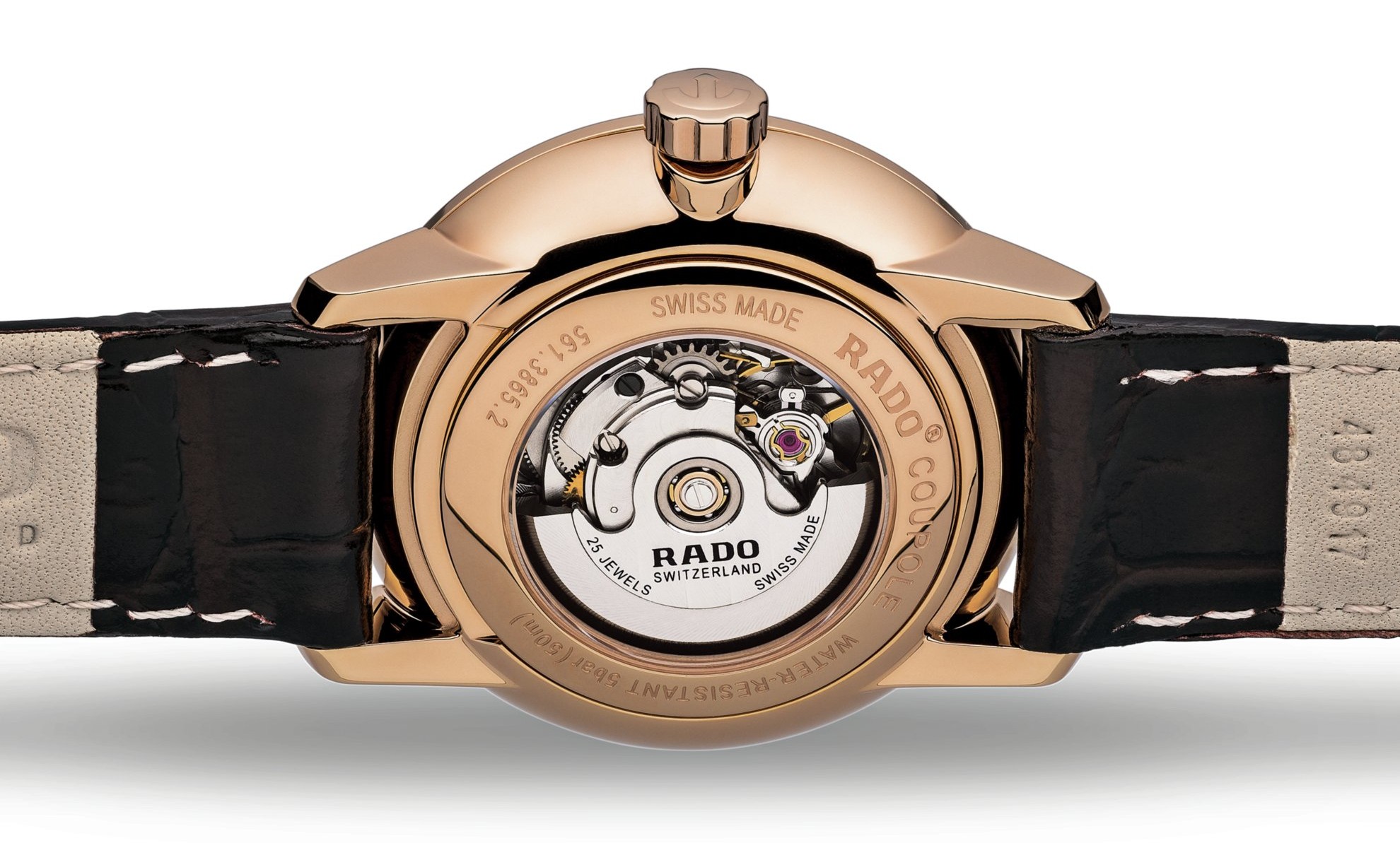 Rado Coupole Classic Automatic R22865765 jsou dámské elegantní automatické hodinky na hnědém koženém řemínku s překlápěcí sponou. Pouzdro s PVD úpravou v barvě růžového zlata má průměr 31,8 milimetru. Číselník v barvě šampaň zdobený 8 diamanty je chráněn safírovým sklíčkem s oboustrannou antireflexní vrstvou. Průhledné dýnko umožňuje pohled na mechanický strojek dekorovaný ženevskými pruhy. Tento mechanický strojek R561 (03.561.831) s automatickým nátahem a rezervou chodu 44 hodin disponuje funkcí hackingu (zastavení vteřinové ručky při vytažení korunky do krajní polohy) a je možné ho v případě potřeby natahovat i ručně. Díky použití antimagnetického vlásku setrvačky Nivachron™ z titanové slitiny je vysoce odolný vůči vlivům magnetického pole. Pro dosažení co nejvyšší možné přesnosti je stroj testován v pěti pozicích. S vodotěsností 5 ATM jsou hodinky odolné proti dešti a při sprchování.