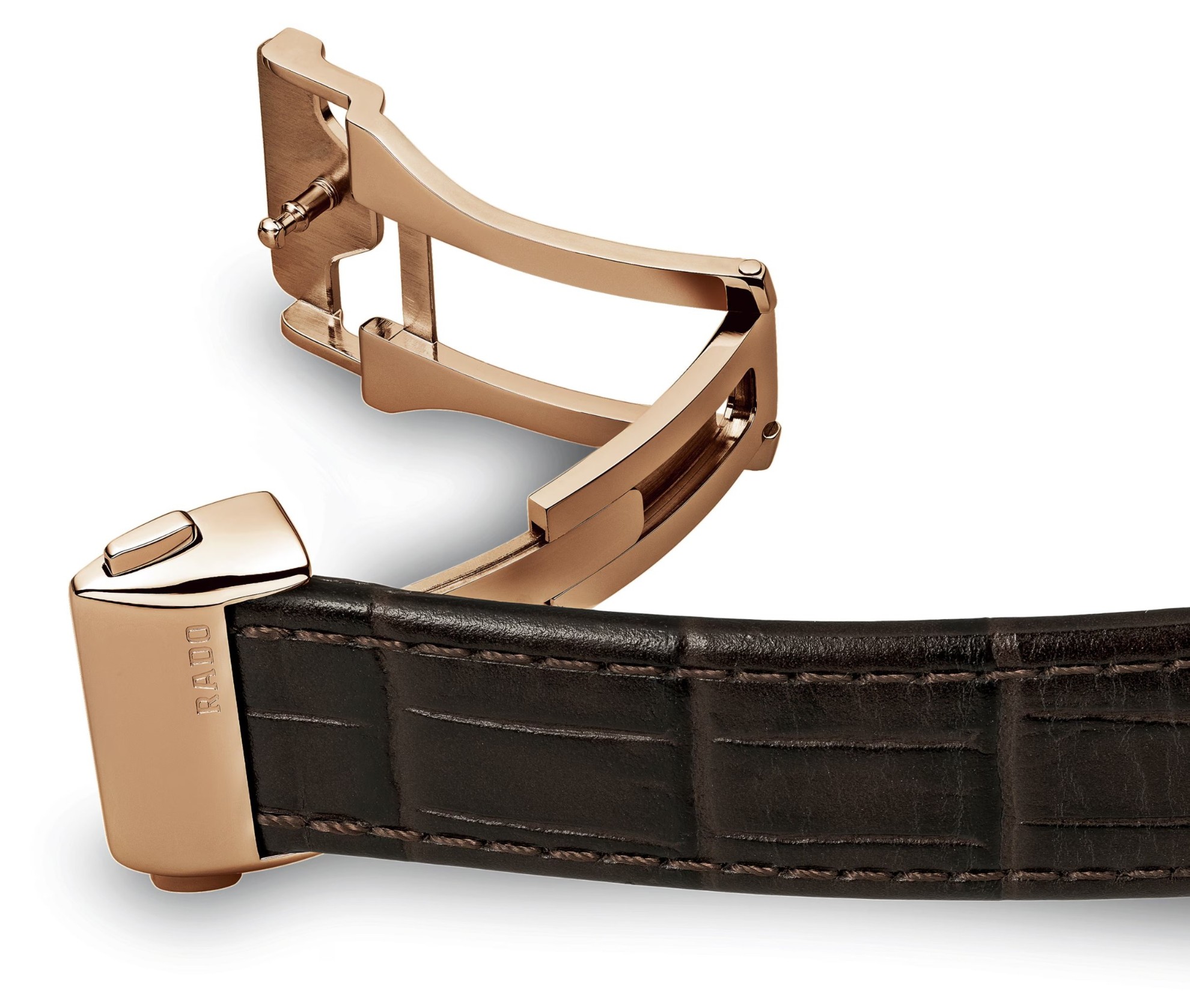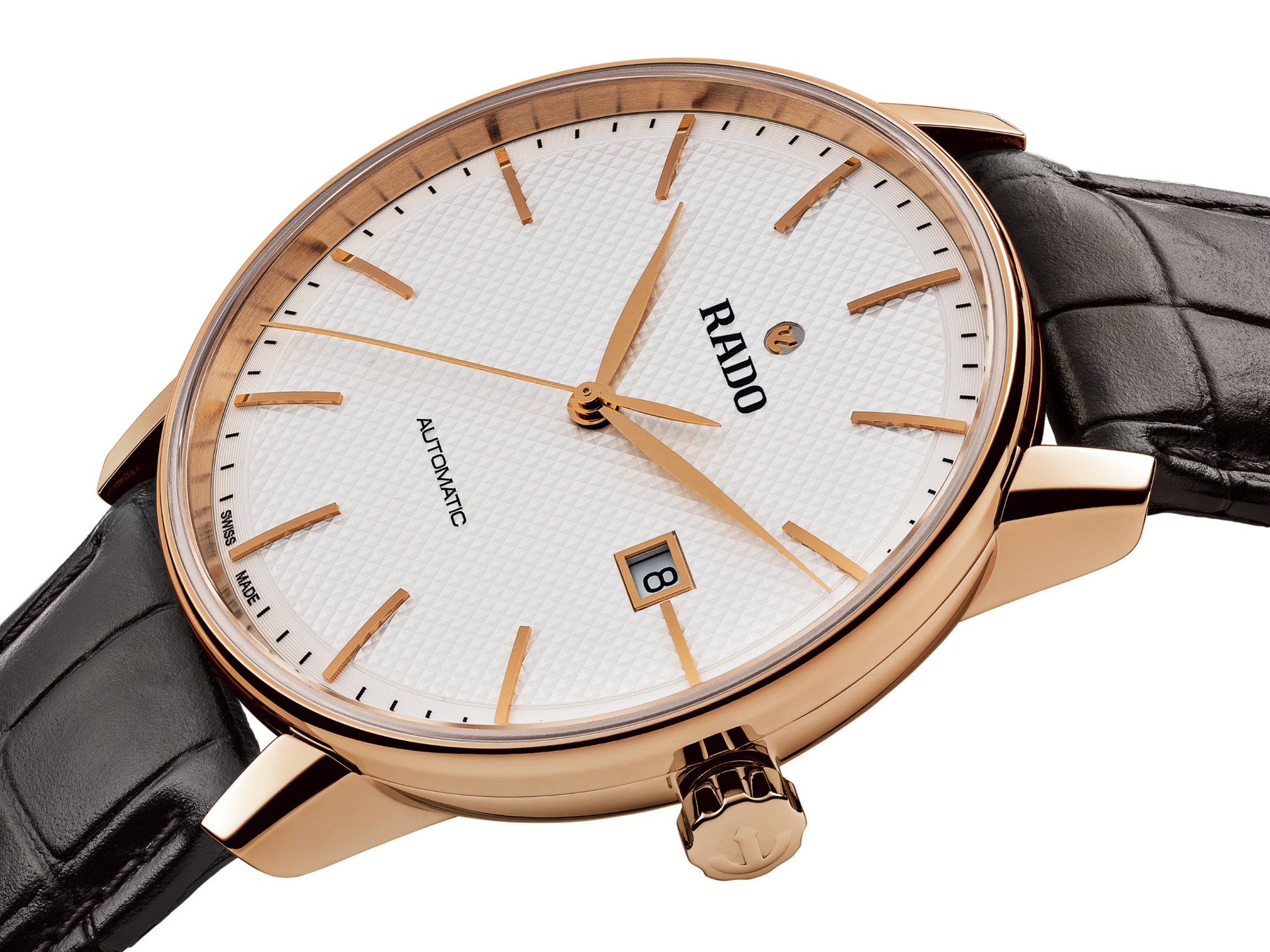 Rado Coupole Classic Automatic R22877025 jsou pánské elegantní automatické hodinky na hnědém koženém řemínku s překlápěcí sponou. Pouzdro s PVD úpravou v barvě růžového zlata má průměr 41 milimetrů. Bílý číselník zdobený giloší s datumovkou na třetí hodině je chráněn safírovým sklíčkem s oboustrannou antireflexní vrstvou. Průhledné dýnko umožňuje pohled na mechanický strojek dekorovaný ženevskými pruhy. Tento mechanický strojek R763 (03.763.532) s automatickým nátahem a rezervou chodu 80 hodin disponuje funkcí hackingu (zastavení vteřinové ručky při vytažení korunky do krajní polohy) a je možné ho v případě potřeby natahovat i ručně. Díky použití antimagnetického vlásku setrvačky Nivachron™ z titanové slitiny je vysoce odolný vůči vlivům magnetického pole. Pro dosažení co nejvyšší možné přesnosti je stroj testován v pěti pozicích. S vodotěsností 5 ATM jsou hodinky odolné proti dešti a při sprchování.