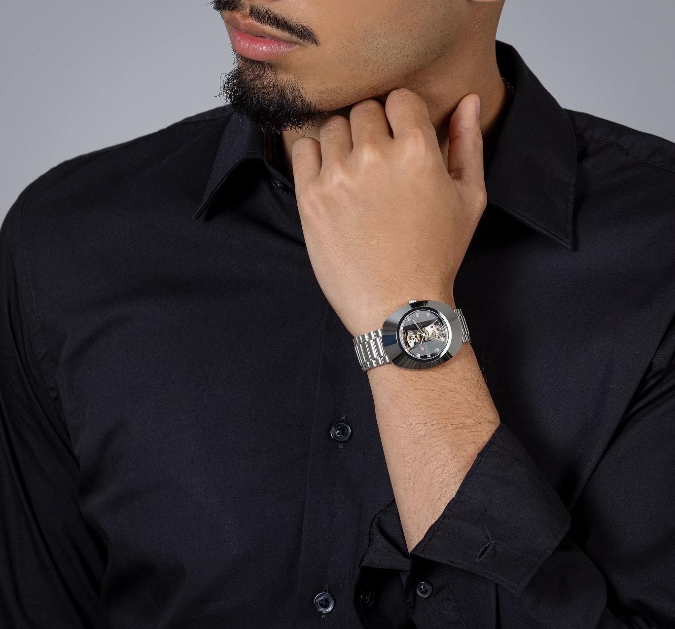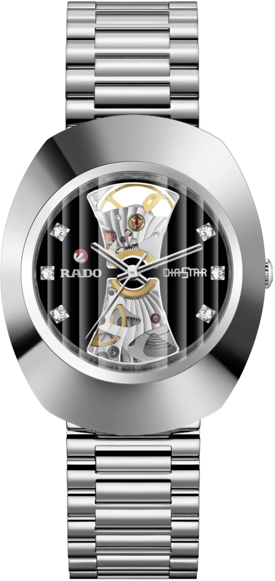 Rado DiaStar Original Open Heart R12063103 jsou automatické unisex hodinky v klasickém stylu s ocelovým náramkem s překlápěcí sponou. Pouzdro o průměru 35 milimetrů je vyrobeno z nerezové oceli. Dvousměrně kartáčovaný černý číselník zdobený 6 zirkony je chráněn fazetovaným safírovým sklem a spolu s průhledným zadním dýnkem nabízí pohled na mechanický strojek R764 (03.764.432) s automatickým nátahem a rezervou chodu 80 hodin. Tento strojek disponuje funkcí hackingu (zastavení vteřinové ručky při vytažení korunky do krajní polohy) a je možné ho v případě potřeby natahovat i ručně. Díky použití antimagnetického vlásku setrvačky Nivachron™ z titanové slitiny je tento kalibr vysoce odolný vůči vlivům magnetického pole. Pro dosažení co nejvyšší možné přesnosti je stroj testován v pěti pozicích. Vodotěsnost hodinek činí 3 ATM a jsou tedy odolné při dešti a mytí rukou.
