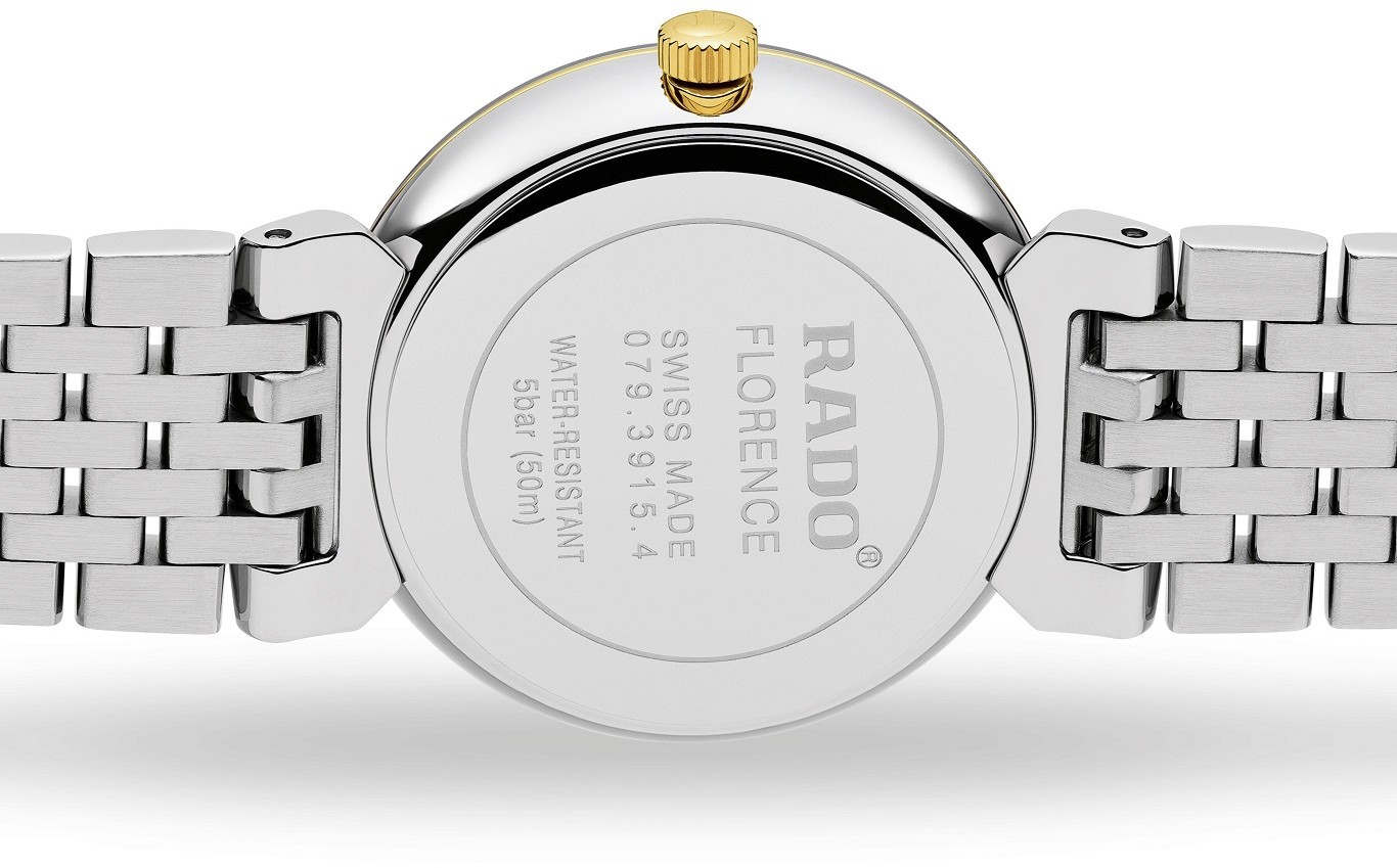 Rado Florence Classic Diamonds R48913703 jsou dámské bateriové hodinky klasického stylu s ocelovým pouzdrem o průměru 30 milimetrů a ocelovým náramkem s motýlkovou sponou. Části náramku a pouzdra jsou opatřeny povrchovou PVD úpravou v barvě žlutého zlata. Černý číselník s datumovkou zdobený 4 diamanty je chráněn tzv. „edge to edge“ safírovým sklem s metalizovaným rámečkem, které sahá až k úplnému okraji pouzdra. Pohon hodinek zajištuje švýcarský quartzový strojek. S vodotěsností 5 ATM jsou hodinky odolné proti dešti a při sprchování.