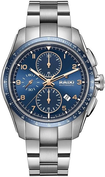 Rado HyperChrome Automatic Chronograph R32042203 jsou pánské sportovní hodinky s ocelovým náramkem a pouzdrem o průměru 44 milimetrů, které disponuje modrou lunetou s tachymetrickou stupnicí z odolného materiálu High-Tech Ceramic. Modrý číselník s efektem slunečního brusu, stopkami a datumovkou na čtvrté hodině je chráněn safírovým sklem s oboustrannou antireflexní vrstvou. Ručičky a indexy jsou potaženy luminiscenční vrstvou Super-LumiNova® pro lepší čitelnost i za zhoršených světelných podmínek. Průhledné zadní dýnko nabízí pohled na mechanický strojek R603 (03.603.011) s automatickým nátahem, který disponuje rezervou chodu 65 hodin. Tento strojek s funkcí hackingu (zastavení vteřinové ručky při vytažení korunky do krajní polohy) je možné v případě potřeby natahovat i ručně. Díky použití antimagnetického vlásku setrvačky Nivachron™ z titanové slitiny je kalibr vysoce odolný vůči vlivům magnetického pole. Pro dosažení co nejvyšší možné přesnosti je stroj testován v pěti pozicích. S vodotěsností 100 metrů jsou hodinky vhodnou volbou pro koupání a šnorchlování.