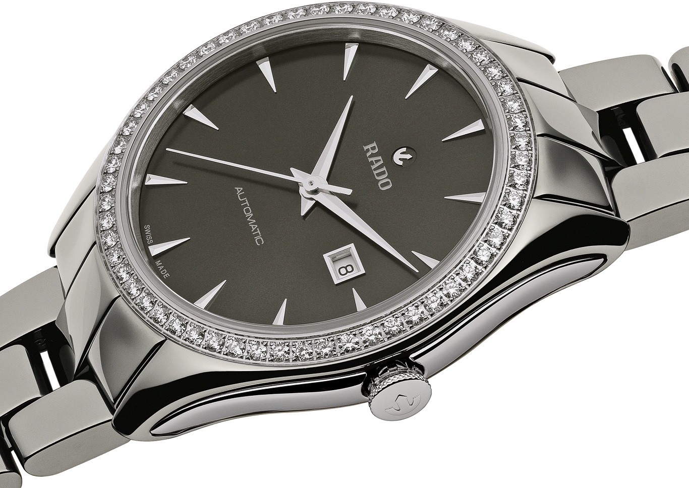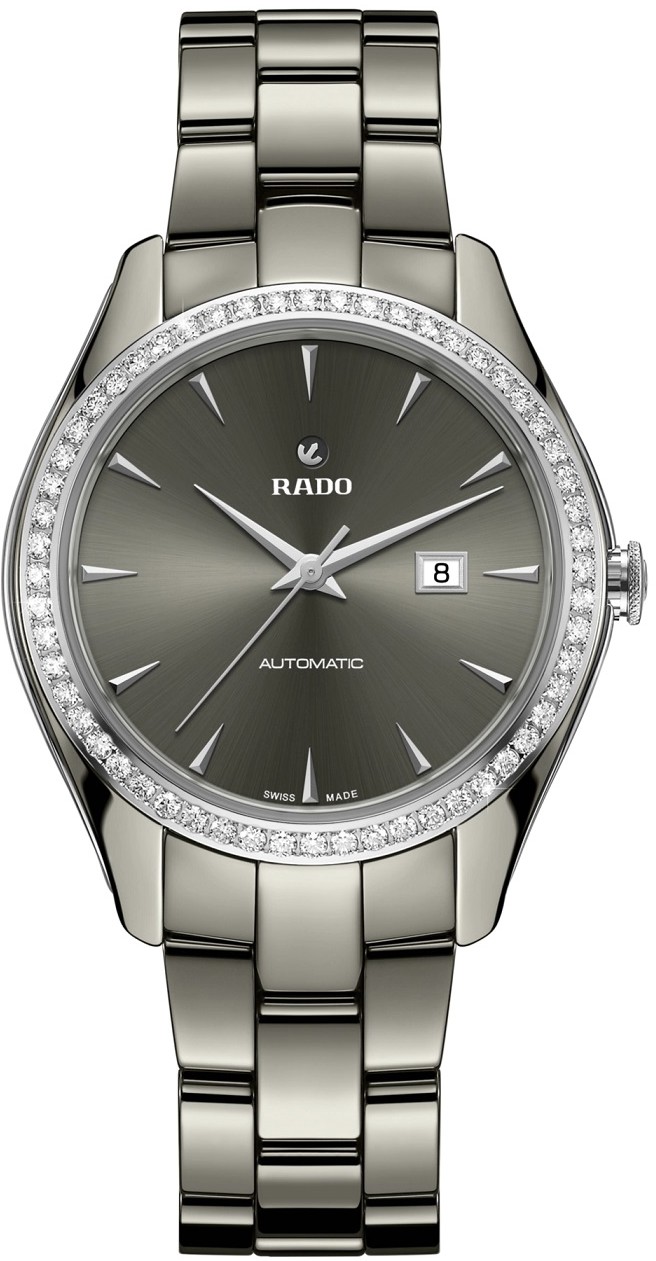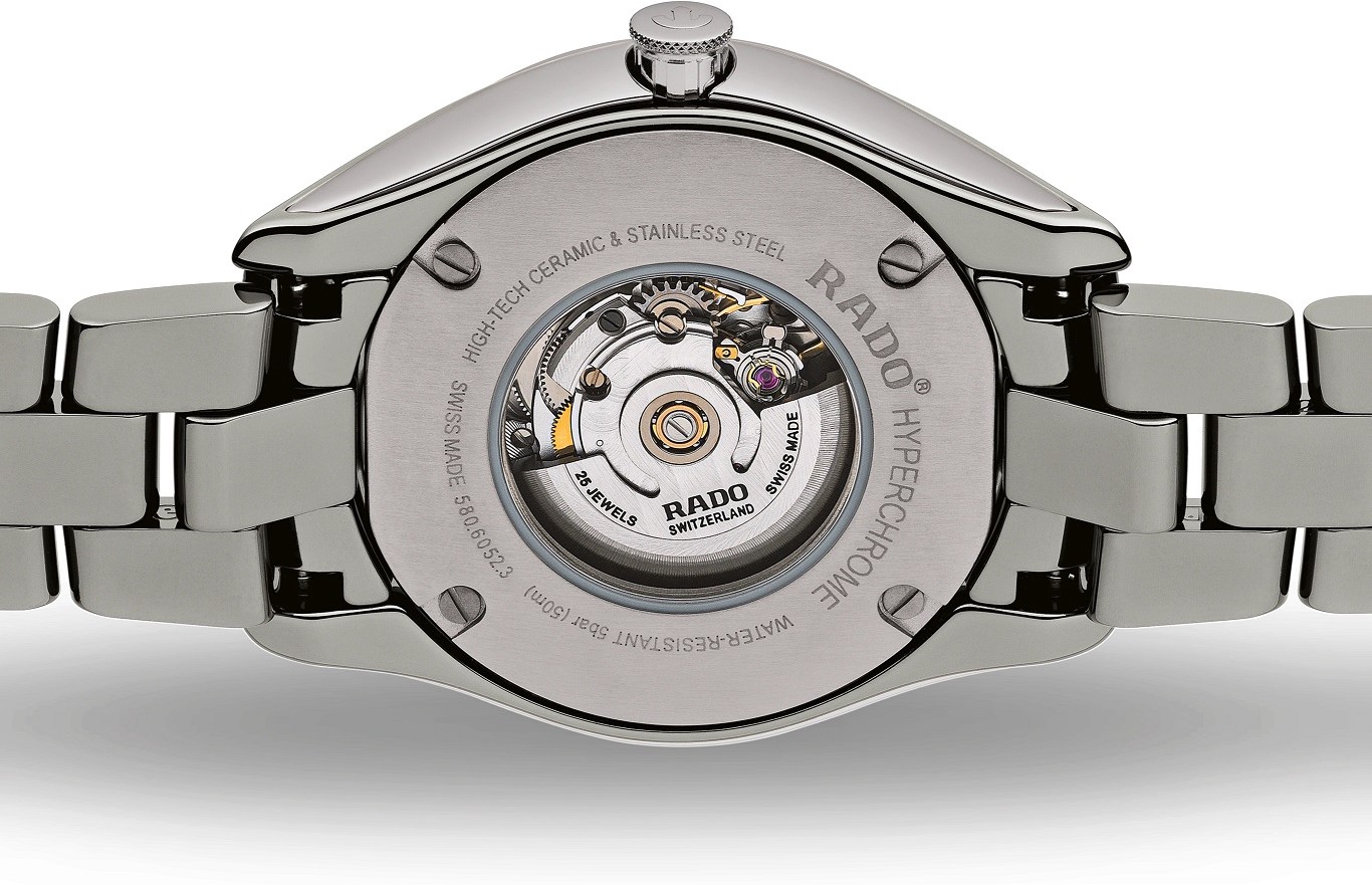 Rado HyperChrome Automatic Diamonds R32051102 jsou dámské klasické hodinky vyrobené ze speciálního materiálu Plasma High-Tech Ceramic, který je vysoce odolný vůči poškrábání. Boky pouzdra, korunka a luneta osazená diamanty jsou z nerezové oceli. Šedý číselník s efektem slunečního brusu a datumovkou na třetí hodině je chráněn safírovým sklem s oboustrannou antireflexní vrstvou a pouzdrem o průměru 36 milimetrů. Průhledné dýnko umožňuje pohled na mechanický strojek R580 (03.580.922) s automatickým nátahem dekorovaný perláží a ženevskými pruhy, který disponuje rezervou chodu 44 hodin. Tento strojek s funkcí hackingu (zastavení vteřinové ručky při vytažení korunky do krajní polohy) je možné v případě potřeby natahovat i ručně. Díky použití antimagnetického vlásku setrvačky Nivachron™ z titanové slitiny je kalibr vysoce odolný vůči vlivům magnetického pole. Pro dosažení co nejvyšší možné přesnosti je stroj testován v pěti pozicích. S vodotěsností 5 ATM jsou hodinky odolné proti dešti a při sprchování.