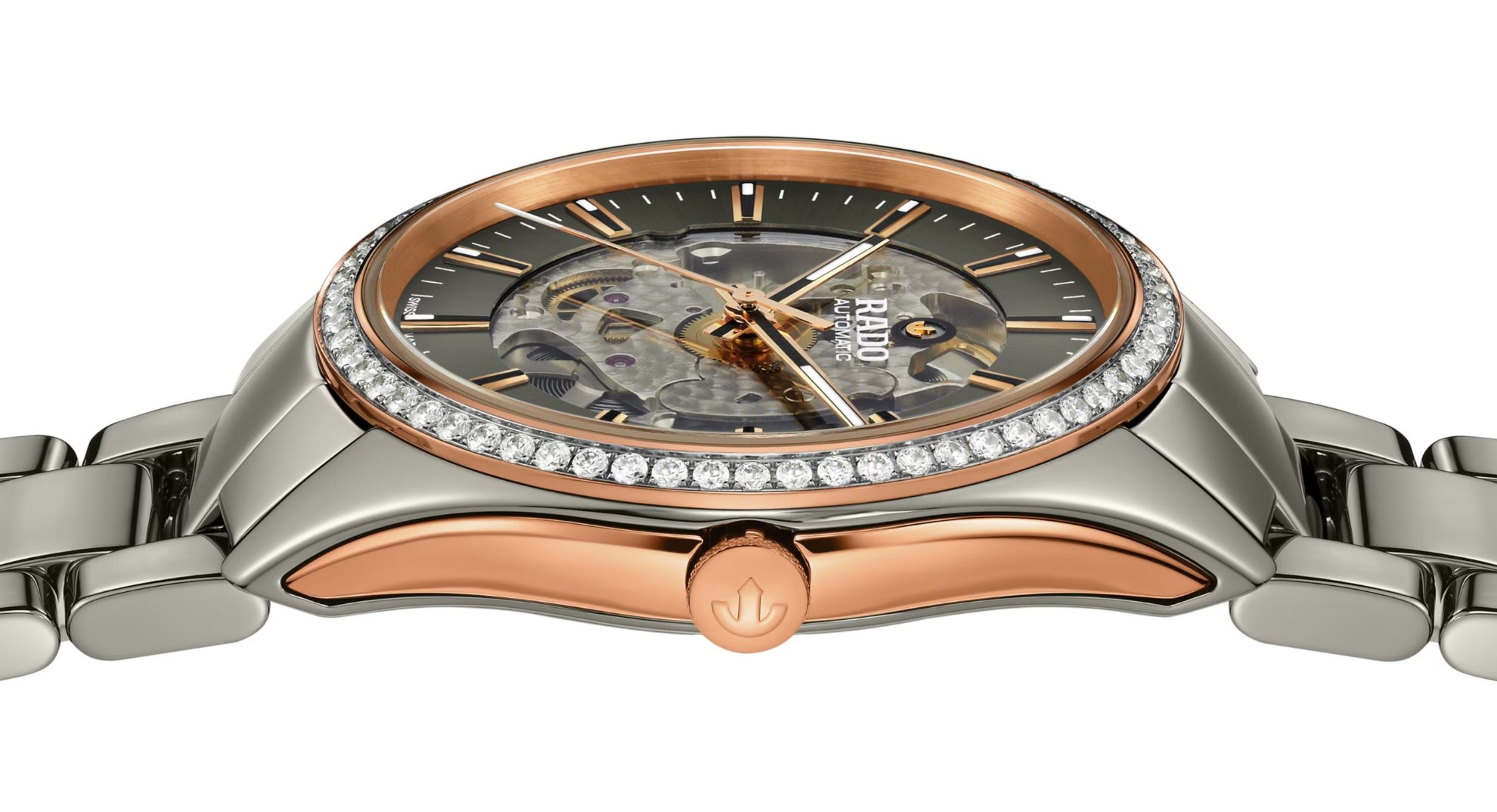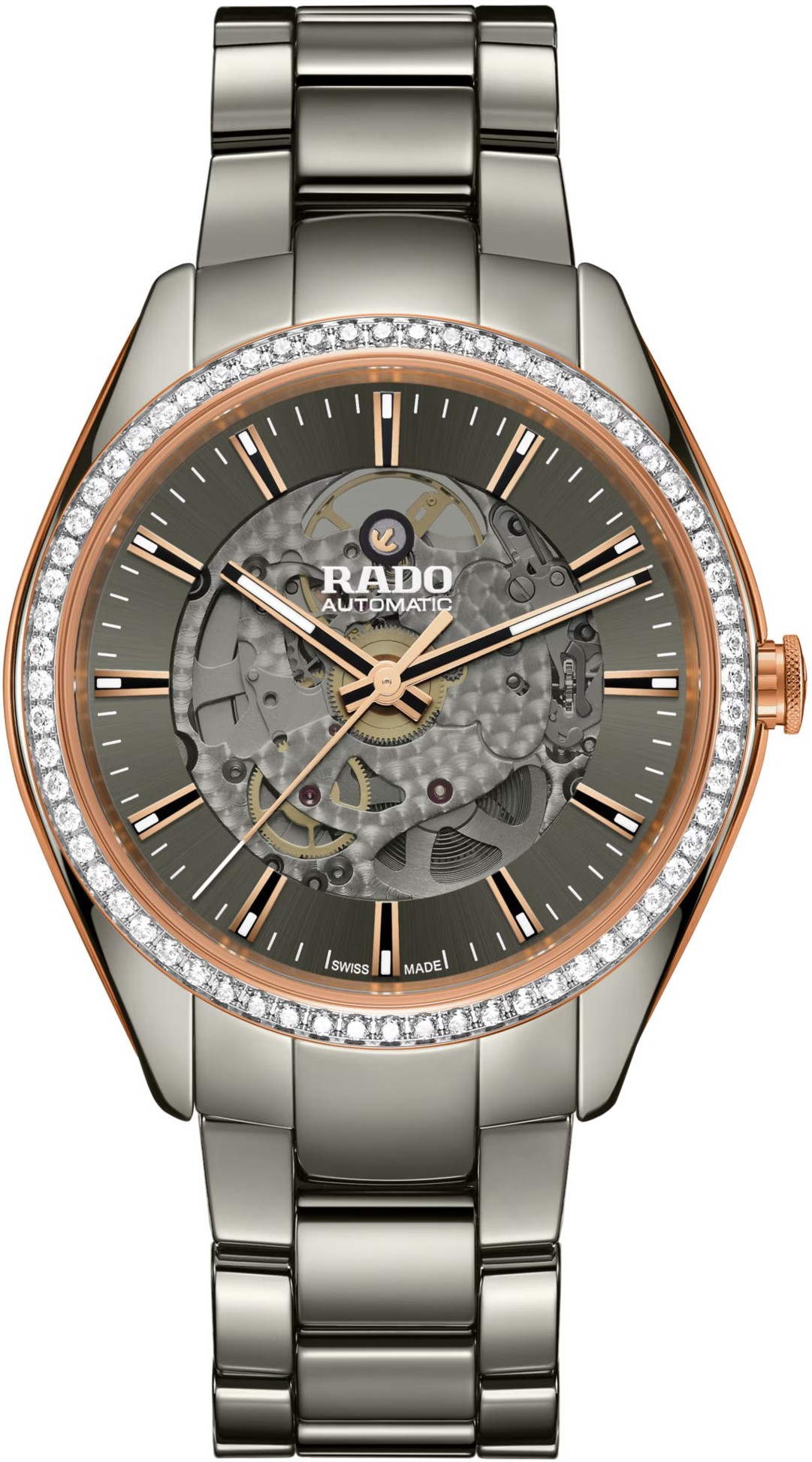 Rado HyperChrome Automatic Diamonds R32158102 jsou unisex hodinky vyrobené ze speciálního materiálu Plasma High-Tech Ceramic, který je vysoce odolný vůči poškrábání. Boky pouzdra, korunka a luneta osazená diamanty jsou z nerezové oceli s PVD úpravou v barvě růžového zlata ladící s detaily na číselníku. Ručičky a indexy jsou potaženy luminiscenční vrstvou Super-LumiNova® pro lepší čitelnost i za zhoršených světelných podmínek. Šedý skeletonový číselník je chráněn safírovým sklem s oboustrannou antireflexní vrstvou a pouzdrem o průměru 42 milimetrů. Spolu s průhledným zadním dýnkem nabízí pohled na mechanický strojek R734 (03.734.435) s automatickým nátahem, který disponuje rezervou chodu 80 hodin. Tento strojek s funkcí hackingu (zastavení vteřinové ručky při vytažení korunky do krajní polohy) je možné v případě potřeby natahovat i ručně. Díky použití antimagnetického vlásku setrvačky Nivachron™ z titanové slitiny je kalibr vysoce odolný vůči vlivům magnetického pole. Pro dosažení co nejvyšší možné přesnosti je stroj testován v pěti pozicích. S vodotěsností 5 ATM jsou hodinky odolné proti dešti a při sprchování.
