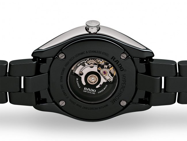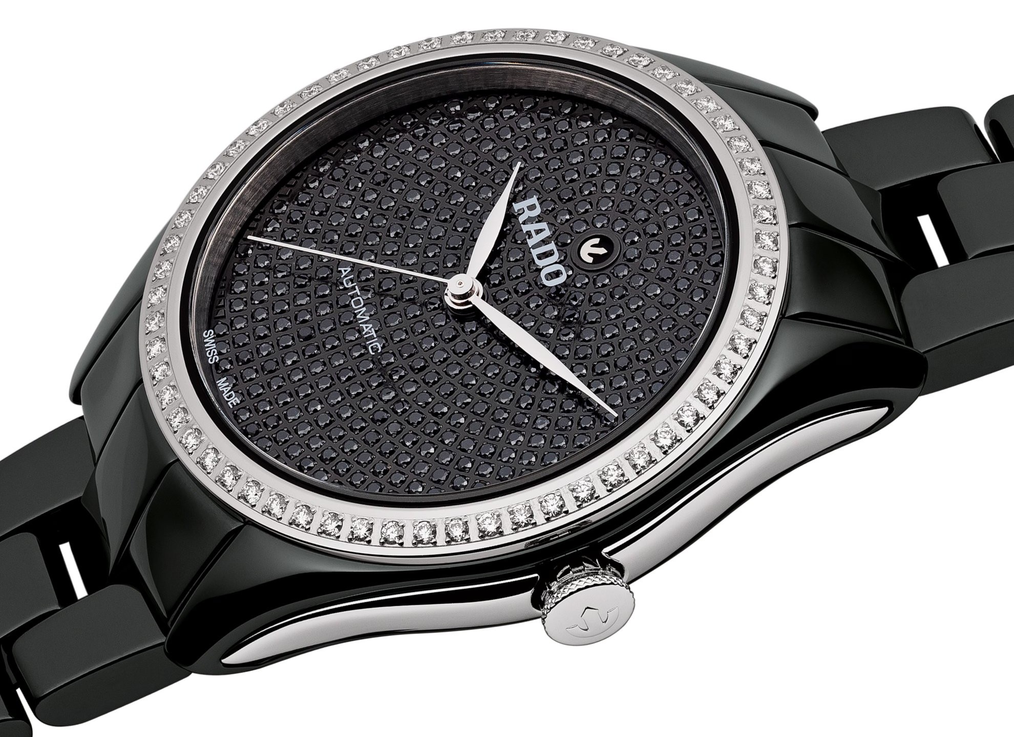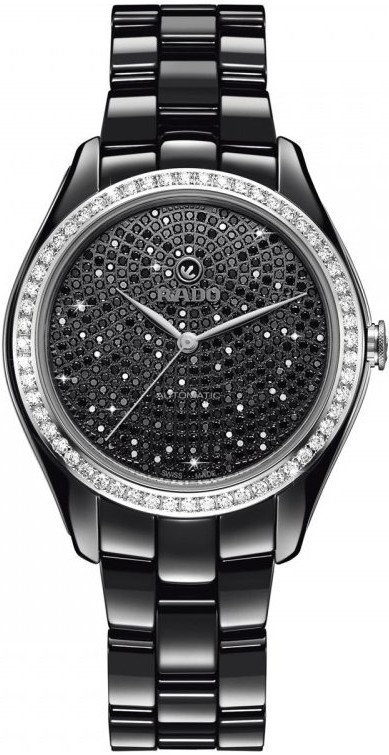 Rado HyperChrome Automatic Diamonds R32482722 jsou dámské klasické hodinky vyrobené ze speciálního materiálu High-Tech Ceramic, který je vysoce odolný vůči poškrábání. Boky pouzdra, korunka a luneta osazená diamanty jsou z nerezové oceli. Třpytivý černý číselník zdobený diamanty je chráněn safírovým sklem s oboustrannou antireflexní vrstvou a pouzdrem o průměru 36 milimetrů. Průhledné dýnko umožňuje pohled na mechanický strojek R580 (03.580.030) s automatickým nátahem dekorovaný perláží a ženevskými pruhy, který disponuje rezervou chodu 44 hodin. Tento strojek s funkcí hackingu (zastavení vteřinové ručky při vytažení korunky do krajní polohy) je možné v případě potřeby natahovat i ručně. Díky použití antimagnetického vlásku setrvačky Nivachron™ z titanové slitiny je kalibr vysoce odolný vůči vlivům magnetického pole. Pro dosažení co nejvyšší možné přesnosti je stroj testován v pěti pozicích. S vodotěsností 5 ATM jsou hodinky odolné proti dešti a při sprchování.